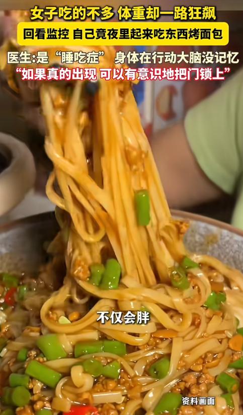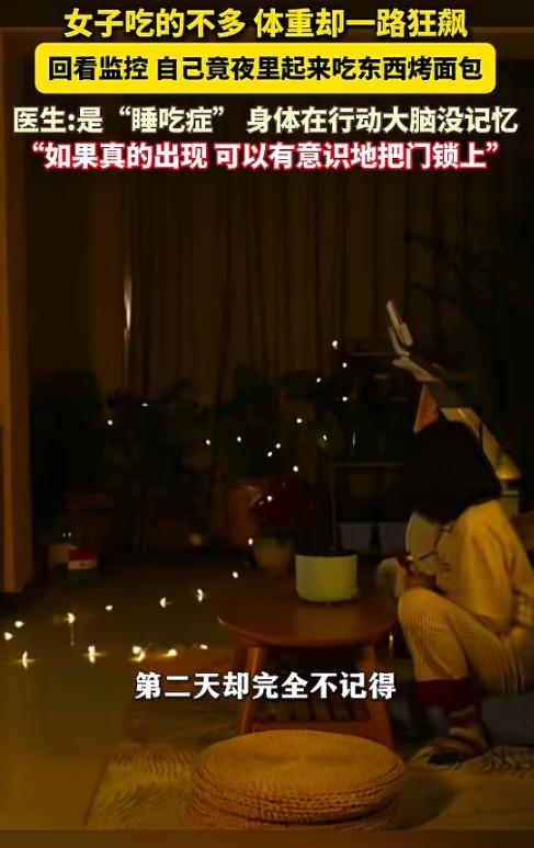 “都睡着了还能吃东西?!”近日,浙江杭州,一女子吃的不多,但体重却明显增长,在医生建议下看监控,她才知道这一年多来,时不时会在夜里起来吃东西,甚至穿睡衣下楼买水果,但这一切女子都浑然不觉,最后被诊断为睡吃症!网友:估计减肥总失败! 不知道大家有没有过这种崩溃时刻? 明明已经把嘴管得严严实实,每顿饭都精打细算控热量,米饭不敢多舀一勺,油炸食品、甜食更是连碰都不碰。 可体重秤上的数字就是怎么减都减不下去,越减越着急,越着急越纳闷,到底是哪里出了岔子? 浙江杭州就有一位女子,遭遇了这种让人摸不着头脑的事儿。 但是她体重莫名暴涨的背后,藏着一个连自己都完全不知情的秘密。 女子平时就特别在意身材,平时吃饭格外克制。 而且她也不是那种懒懒散散不爱动的人,下班之后总会去小区楼下散散步,偶尔也会跟着手机视频跳会儿减脂操。 按道理说,这样的饮食加运动,体重就算不往下掉,也绝不会一个劲地往上冲。 一天,她发现自己的体重开始慢慢变重,最奇怪的是,她感觉家里的食物竟然在自己不知道的情况下减少了。 起初她没太当回事,只以为是自己记错了家里食物的量,以及偶尔嘴馋没忍住,或者运动偷了懒,于是就对自己更严格了。 饮食上再减分量,运动也比以前更勤快。 可不管她怎么努力,体重不仅没降,反而越来越重。平时穿衣服,以前合身的裤子根本拉不上拉链,上衣也变得紧绷绷的。 而且女子发现家里的食物真的在她没有吃的印象的情况下,就自己减少了! 这反常的现象,让她赶紧去了医院。 医生沉思了好一会儿,结合她的情况,突然想到了一种可能性,就问她:“平时晚上睡觉的时候,有没有家人或者室友说过你夜里起来过?” 女子听完一脸茫然,连忙摇头说:“我晚上睡得特别沉,从来没有半夜醒过的记忆,而且我一个人住,也没人能告诉我夜里发生了什么。” 看着她一脸困惑的样子,医生就给她提了个建议:“你在家里装个监控吧,看看夜里是不是有什么异常情况,很多时候,人在睡眠状态下,可能会做出一些自己完全没有记忆的行为。” 女子听从了医生的建议装了监控,之后,她还是和平时一样,正常上班、吃饭、运动、睡觉。 就这样过了三四天,她趁着有空,就打开监控录像,打算看看这几天夜里自己有没有什么异常。 而监控里的画面,让她根本不敢相信自己的眼睛——那里面的人,明明是自己,可做的事情,她却一点印象都没有。 监控录像里显示,这几天夜里,她几乎每天都会走到厨房,然后拿起厨房里的食物,大口大口地吃起来。 就像是在无意识地完成一项任务,吃完之后,她又慢悠悠地走回卧室,躺下继续睡觉。 全程没有任何醒来的迹象,更没有任何记忆留存。 更让她震惊的是,有一天夜里,她居然穿着睡衣、拖着拖鞋,直接走出了家门,下楼去了小区门口的水果店,买了水果。 可她却完全没有任何印象,要是没有监控录像,她打死都不敢相信,自己居然做过这些事。 看完监控之后,女子又惊又怕,赶紧拿着监控录像,再次去了医院,把自己看到的一切都告诉了医生。 医生看完监控录像,再结合之前的检查结果,很快就给出了诊断结果——她得了“睡吃症”。 医学上也叫睡眠相关进食障碍,属于异态睡眠的一种。 简单来说,就是“身体在自主吃东西,大脑却还在睡觉”——自己根本不知道自己做过什么。 这件事被分享到网上之后,很快就引发了网友们的热烈讨论。 很多网友都表示:“长见识了,第一次听说这种病”。 还有不少网友说:“原来减肥总失败,是因为夜里偷偷干饭自己不知道啊” 也有网友说到:“我怀疑我也有这种情况,不然我怎么越减越胖!” (信息来源:美丽浙江《杭州一女子体重莫名增加竟是夜里偷吃东西?医生:是“睡吃症”》)