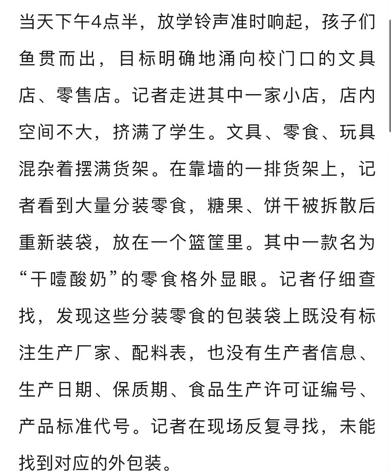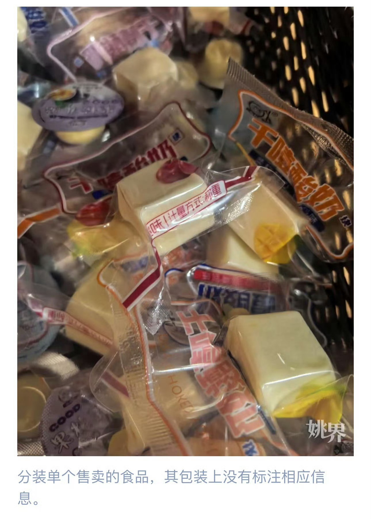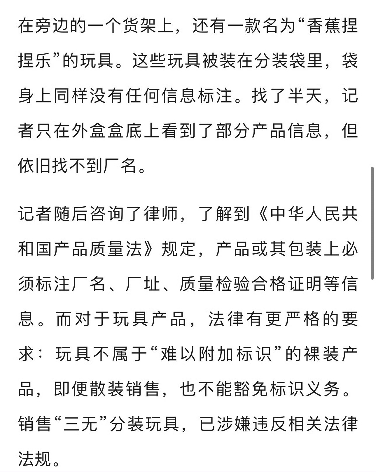 余姚一学校附近小店疑似销售三无零食和玩具 曝光!余姚一学校附近小店疑似销售“三无”零食和玩具群众报料,称马渚镇中心小学附近的文具店疑似售卖“三无”产品,其中一款名为“干噎酸奶”的零食,分装零食的包装袋上既没有标注生产厂家、配料表,也没有生产者信息、生产日期、保质期、食品生产许可证编号、产品标准代号。还有一款名为“香蕉捏捏乐”的玩具。这些玩具被装在分装袋里,袋身上同样没有任何信息标注,只在外盒盒底上看到了部分产品信息,但依旧找不到厂名。