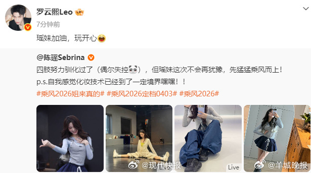【#罗云熙为陈瑶浪姐打call#】 3月27日,乘风2026定档,作为参加节目的姐姐,发文:“四肢努力驯化过了(偶尔失控),但瑶妹这次不会再犹豫,先猛猛乘风而上!” 也为陈瑶打call:“瑶妹加油,玩开心。”(现代快报)更多消息:#郭麒麟对接回应KTV传闻##疑似严浩翔社交平台小号##乘风2026官宣阵容##商K##乘风2026定档##孔雪儿壁纸是cortis##陈瑶猛猛乘风而上#(编辑:惠天骄;审签:艾渝)