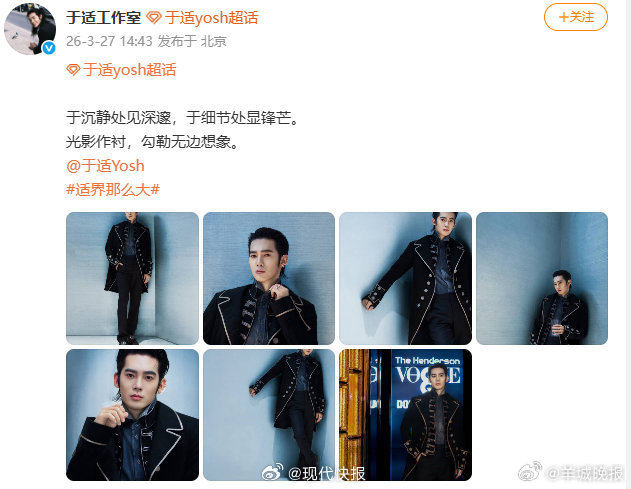 【#于适新造型完全暗夜男爵来的#】3月27日,释出 最新造型:“于沉静处见深邃,于细节处显锋芒。光影作衬,勾勒无边想象。”网友表示:“完全暗夜男爵,耳廓一圈碎钻很别致。” (现代快报)更多消息:#郭麒麟对接回应KTV传闻##疑似严浩翔社交平台小号##乘风2026官宣阵容##商K##乘风2026定档##孔雪儿壁纸是cortis#(编辑:惠天骄;审签:艾渝)