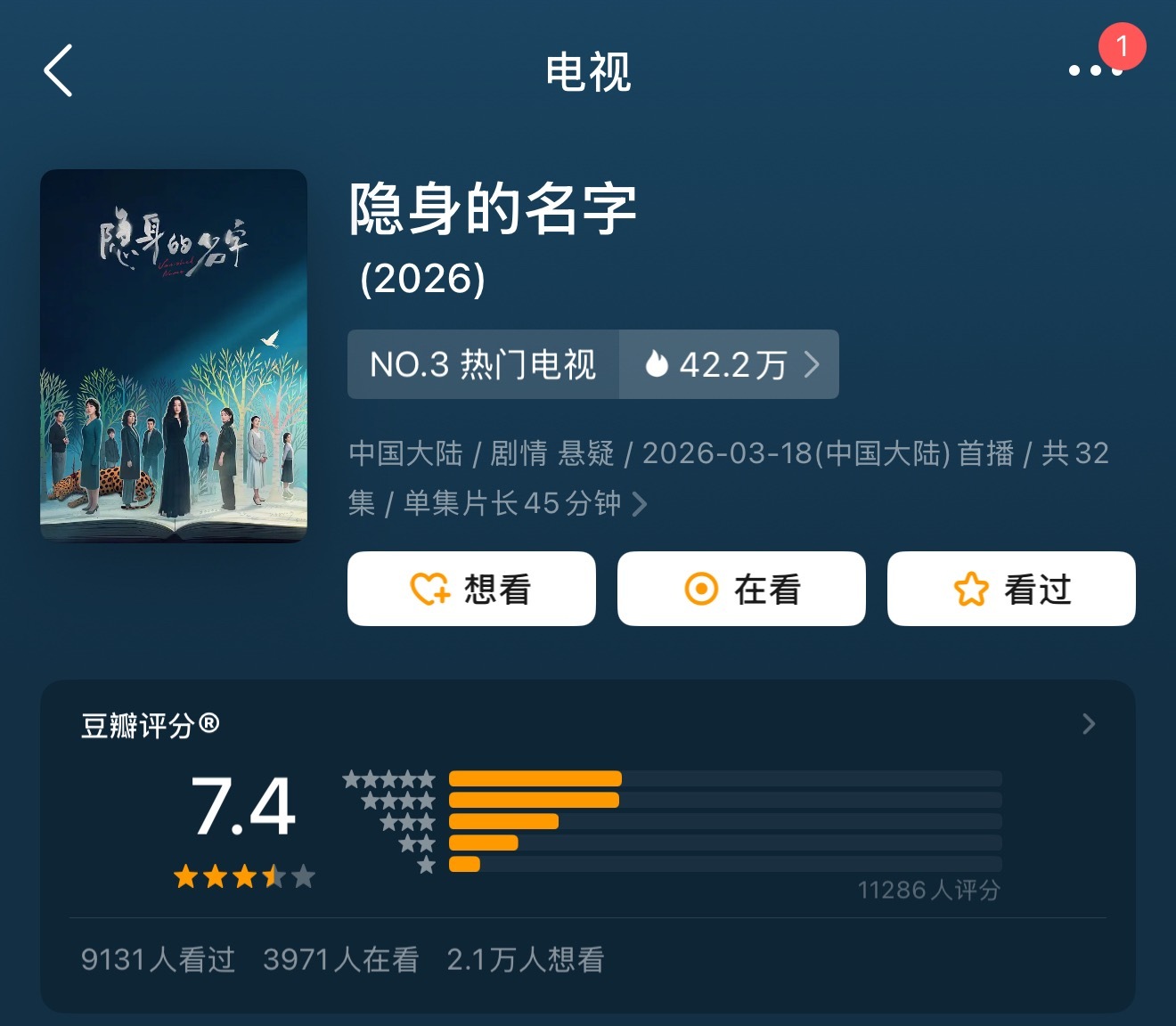 《你好1983》豆瓣开分6.7《隐身的名字》豆瓣开分7.4你好1983豆瓣开分6