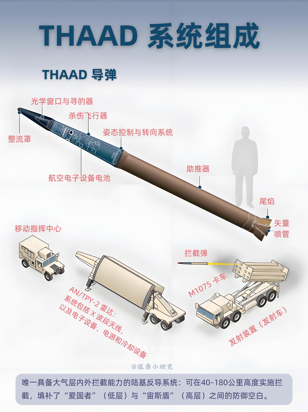 萨德:唯一可大气层内外拦截的陆基反导系统? 大名鼎鼎的萨德反导系统,是美国研发的陆基战区核心反导防御系统。 1、系统核心由拦截弹、AN/TPY-2 雷达、移动指挥中心、发射车组成。拦截弹可在 40-180 公里高度实现大气层内外拦截,填补了爱国者与宙斯盾之间的反导防御空白。 2、作战时先由雷达探测来袭导弹、估算撞击点,锁定目标后发射拦截弹,杀伤飞行器持续跟踪目标,最终以动能直接碰撞摧毁目标,全程通过卫星链路对接地面指挥站。 萨德,是美国构建全球反导体系的关键核心组成部分。