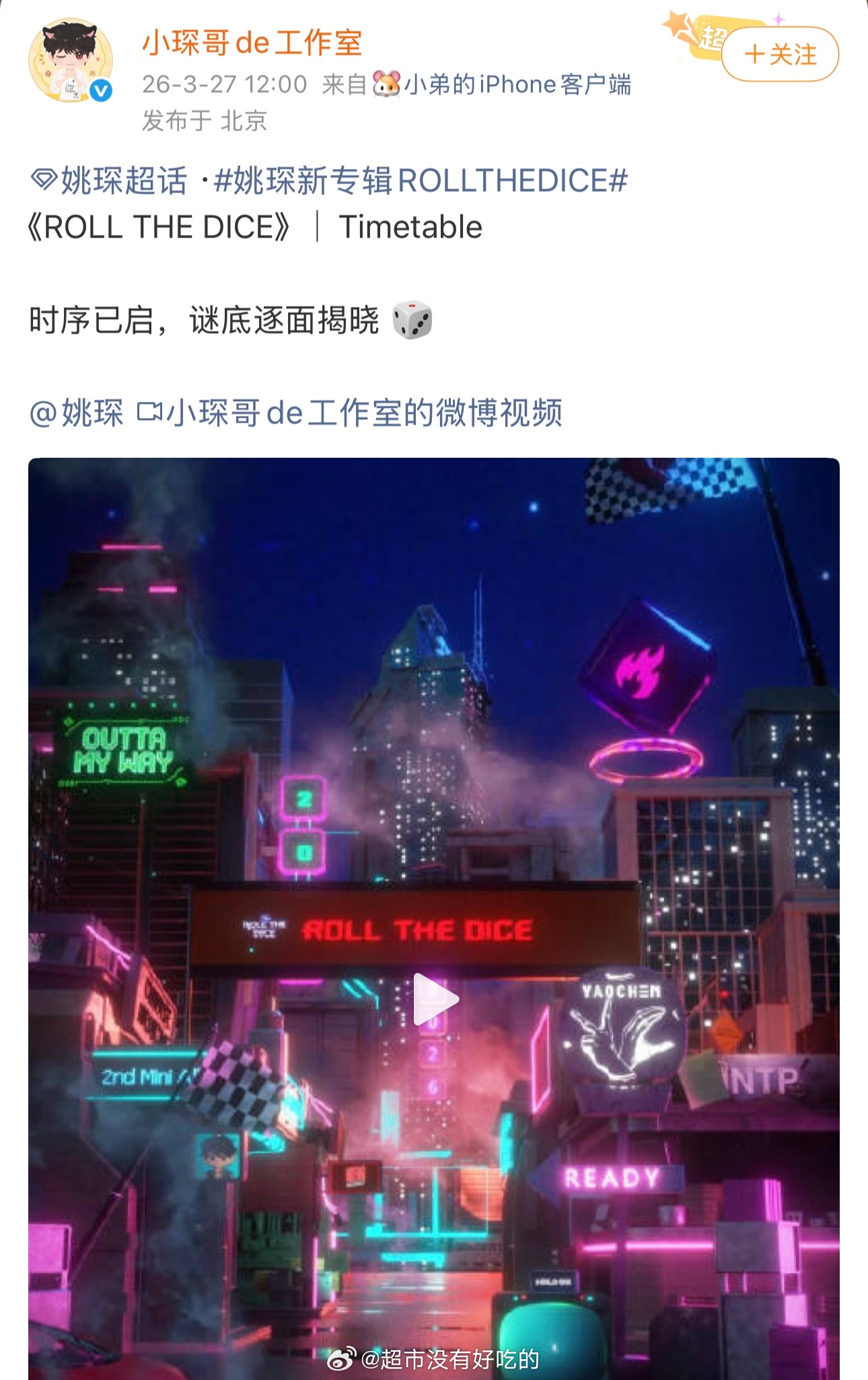 姚琛把粉丝喂得很饱姚琛新专每首歌都有MV 昨天姚琛直播还在西藏高原拍新歌MV,今天新专辑预热就来了全新唱跳专辑《ROLL THE DICE》Timetable官宣,满满当当的新专辑物料,把粉丝喂得好饱期待正式上线啦