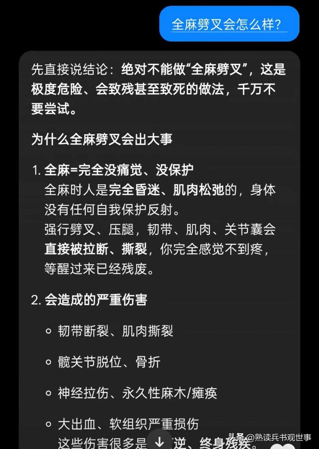 女子全麻后挑战一字马,护士当场吓懵:这不是秀,是在玩命! 刷到这个新闻,我血压直接飙到180! 一个姑娘,刚做完全麻手术,人还没彻底清醒,就着麻药劲居然直接来了个一字马? 我真想说一句:大姐,收了神通吧。 全麻是什么?不是让你睡一觉,是直接把你的“保命系统”给关机了!保护机制中负责反馈身体异样的痛觉部门整体休假了。 这时候你去掰自己,身体的状况根本没有回馈,说白了,只要狠的下手,把大腿耍个大风车都感觉不到疼。 正常人的一字马,是痛到极限停下来。全麻后的你,是直接掰到肌肉撕脱、神经断裂、关节报废。必须提醒你,这种伤是不可逆的!你后半辈子可能连正常走路都费劲,就为了这一下“挑战成功”? 这点流量的代价真的值吗? 无知不可怕,可怕的是无知还任性! 这里必须拿你做一个反面案例,提醒众人,你的行为相当于蒙住眼睛跳悬崖,看不到风险,但风险极大。切不可让你的“想当然”,变成后半辈子的“坐轮椅”。 麻药没醒,咱就老老实实躺着,别给自己的人生上强度! 希望没事,祝君安好。