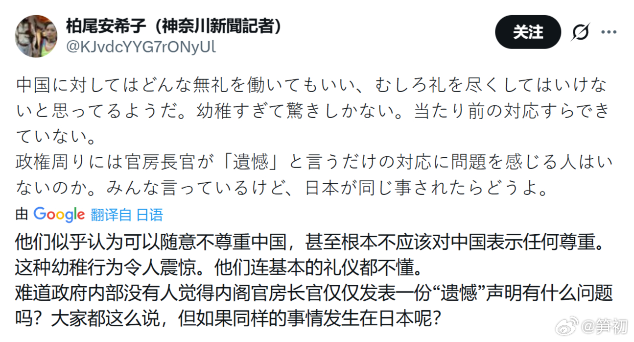 日本记者、作家柏尾安希子发文质疑日本政府和日本人对中国不尊重且双标:“他们似乎认为可以随意不尊重中国,甚至根本不应该对中国表示任何尊重。这种幼稚行为令人震惊。他们连基本的礼仪都不懂。难道政府内部没有人觉得内阁官房长官仅仅发表一份“遗憾”声明有什么问题吗?大家都这么说,但如果同样的事情发生在日本呢?”何止是这件事,一个日本人在中国被袭击,日本媒体包括不少中国媒体都对中国人口诛笔伐,连日本外务省都发声谴责;而中国人在日本成为受害者的杀人、抢劫等恶性犯罪案件过去屡见不鲜,仅2024年就发生68起,而高峰时期一年近百起,但是不知道是外务省的经费太充足,还是我们出于“维护中日友好关系大局”,这些案件在中日媒体中都鲜见报道。何止是日本,西方国家哪一个不双标?是什么让它们如此双标?除了它们的虚伪和无耻,很大程度上连我们很多部门、很多人对自己和对洋人都双标,动不动就要对别人“高看一眼”。有些国家、政客和媒体即便不尊重你也没有受到任何惩罚,甚至打一个巴掌再给颗甜枣,我们就能跟人家和好如初,居然还把这当成善意。一直以来,我们对外交往只希望平息事态息事宁人,而不是杀一儆百以儆效尤。该改改了。