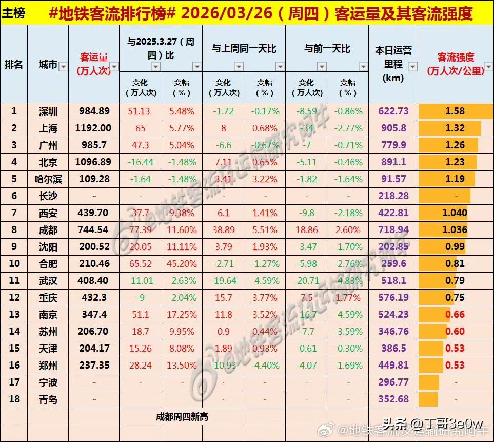 周四广州地铁客流量985万人次以上,重新超过了深圳[呲牙][呲牙][呲牙] 爆料 身边事 排行榜 周四 广州 深圳 2026年3月26日 星期④ 全国重点城市轨道交通客流量排行榜: 上海:1192.00万 北京:1096.89万北京身边事 广州:985.70万 深圳:984.89万深圳地铁 成都:744.54万成都身边事 西安:439.70万 重庆:432.30万重庆爆料 武汉:408.40万武汉地铁 南京:347.40万南京地铁 长沙:237万+ 郑州:237.35万郑州爆料 合肥:210.46万合肥身边事 苏州:206.70万苏州地铁 天津:204.17万 沈阳:200.52万沈阳爆料 青岛:100万+青岛身边事 宁波:100万+宁波地铁 哈尔滨109.28万