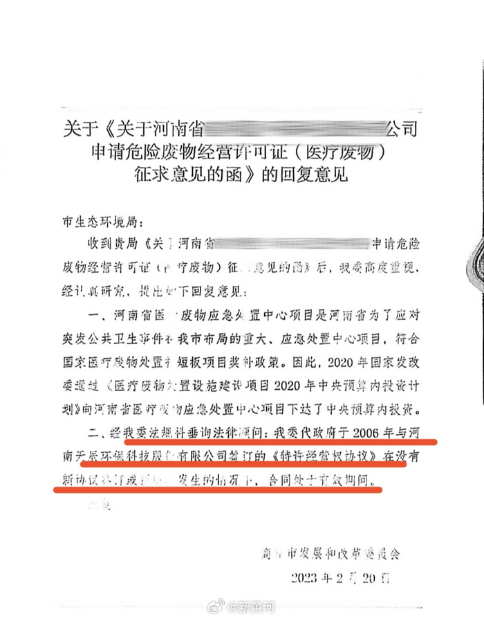 2023年,商丘市民权县一家企业成立了医疗废物应急处置中心,商丘市生态环境局给该中心颁发编号商环许可危废字02号《危险废物经营许可证》。这一变化,与商丘市发展改革委和天辰环保签署的《特许经营权协议》产生直接冲突。