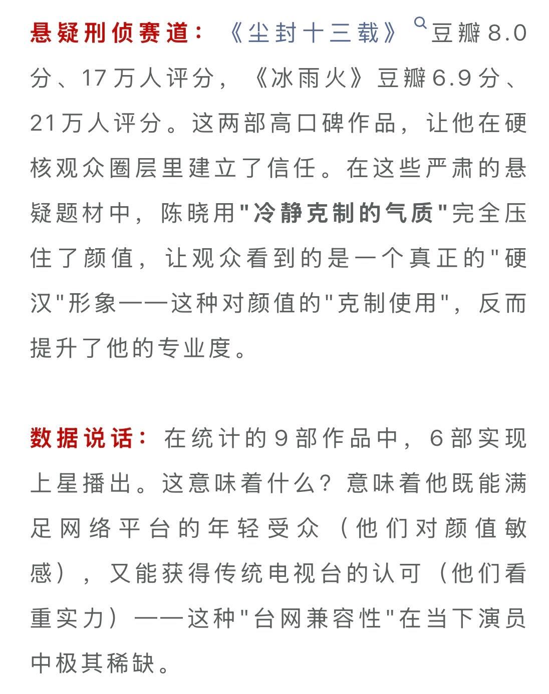 陈晓 的全能早已无须多言了吧?每条赛道都做到最精最好,无论是“质”还是“量”都一样在线,这些年更是沉淀出一种稳重的高级质感了。扛得动头部大剧,担得起各层面观众的认可,也是越来越走出一条品质之路了!放眼看看未来的待播作品同样很让人期待,稳扎稳打,相信收获更多认可与奖项荣誉也完全不是问题