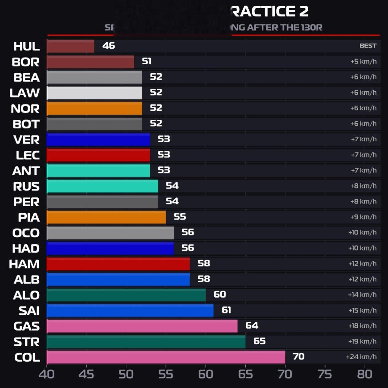 虎扑03月27日讯在F1日本大奖赛第二节自由练习赛结束后的网上数据显示,如今的赛车在经过著名的铃鹿赛道130R之后,由于全油充电产生了明显的速度变化情况,平均速度下降可以达到55km/h,科拉平托的Alpine赛车更是掉速约70km/h,速度变化不同在于各队能量部署策略的差异。