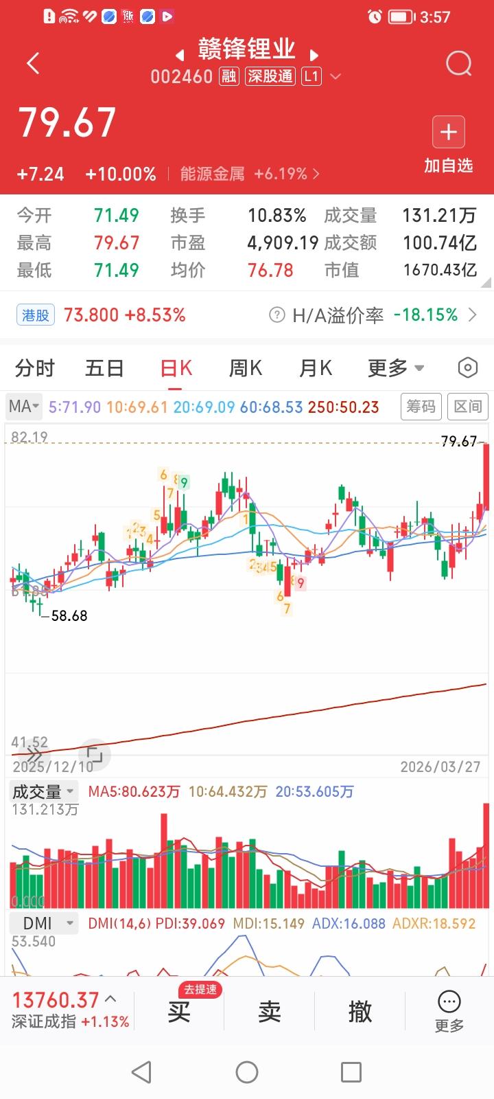 大A欲振乏力之时,赣锋锂业今天一柱擎天,封死涨停!赣疯子又发疯了! 主力也真会选择时机,在人气一片低迷之际,赣锋锂业股价放量涨停,股价再创三年内新高,似乎已向上突破成功。 油价大涨,直接刺激锂电池储能板块走强,主力似乎是有备而来,在构筑了三重底后才向上突破。 可惜咱只有80股戆锋锂业,如果赣锋锂业股价能冲破200元咱就解套了。 赣锋锂业股价这么高,估值也不低,现在这个价位咱也不敢补仓了。