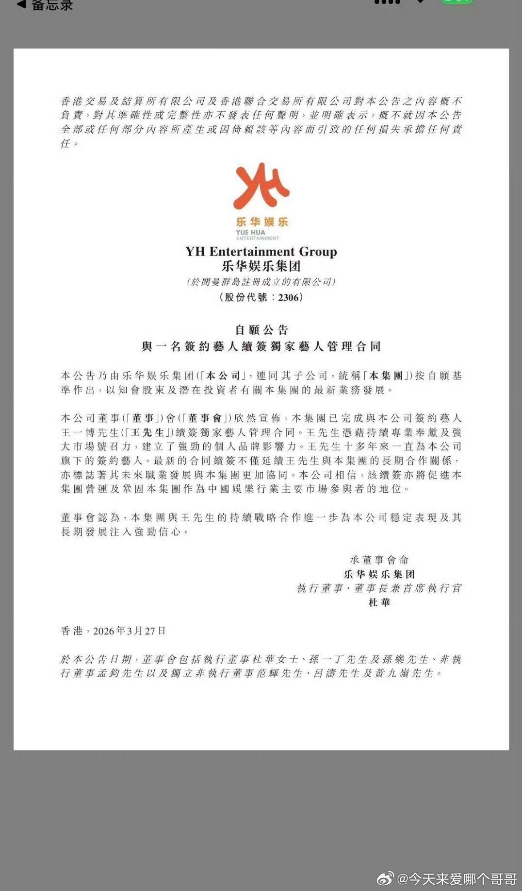 王一博确定与乐华续约