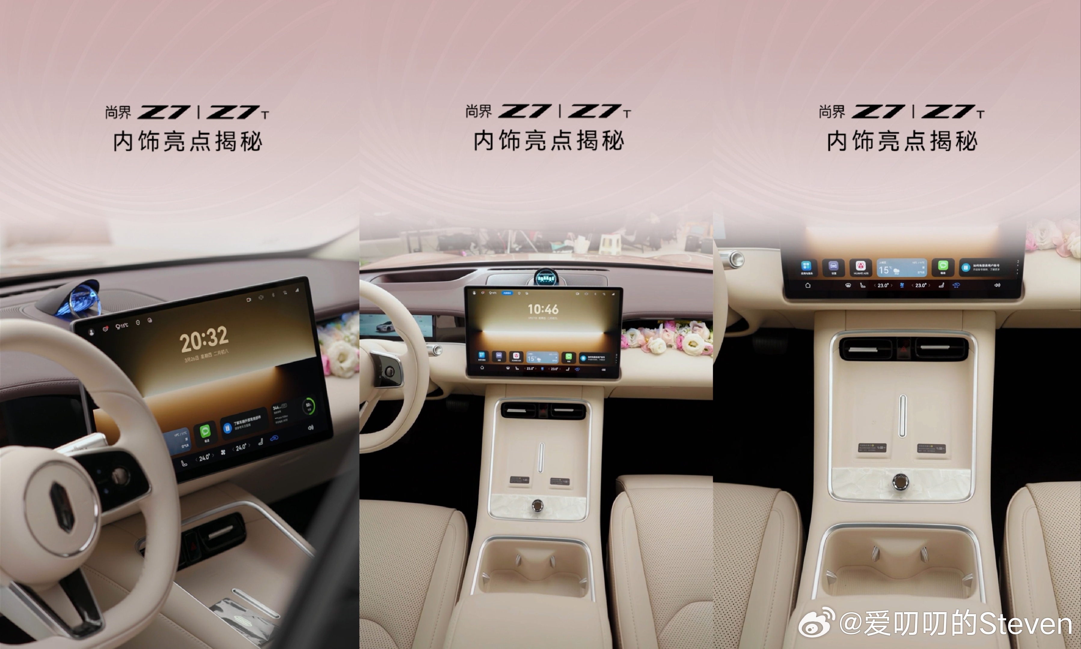 我感觉这个粉+杏选的女生会非常多。11这波顶级推荐,我都种草了。杏色内饰面饰板是贝母材质,整体效果很棒。黑轮毂卡钳统一粉色相当好看。这场直播开场就是满分💯。尚界z7