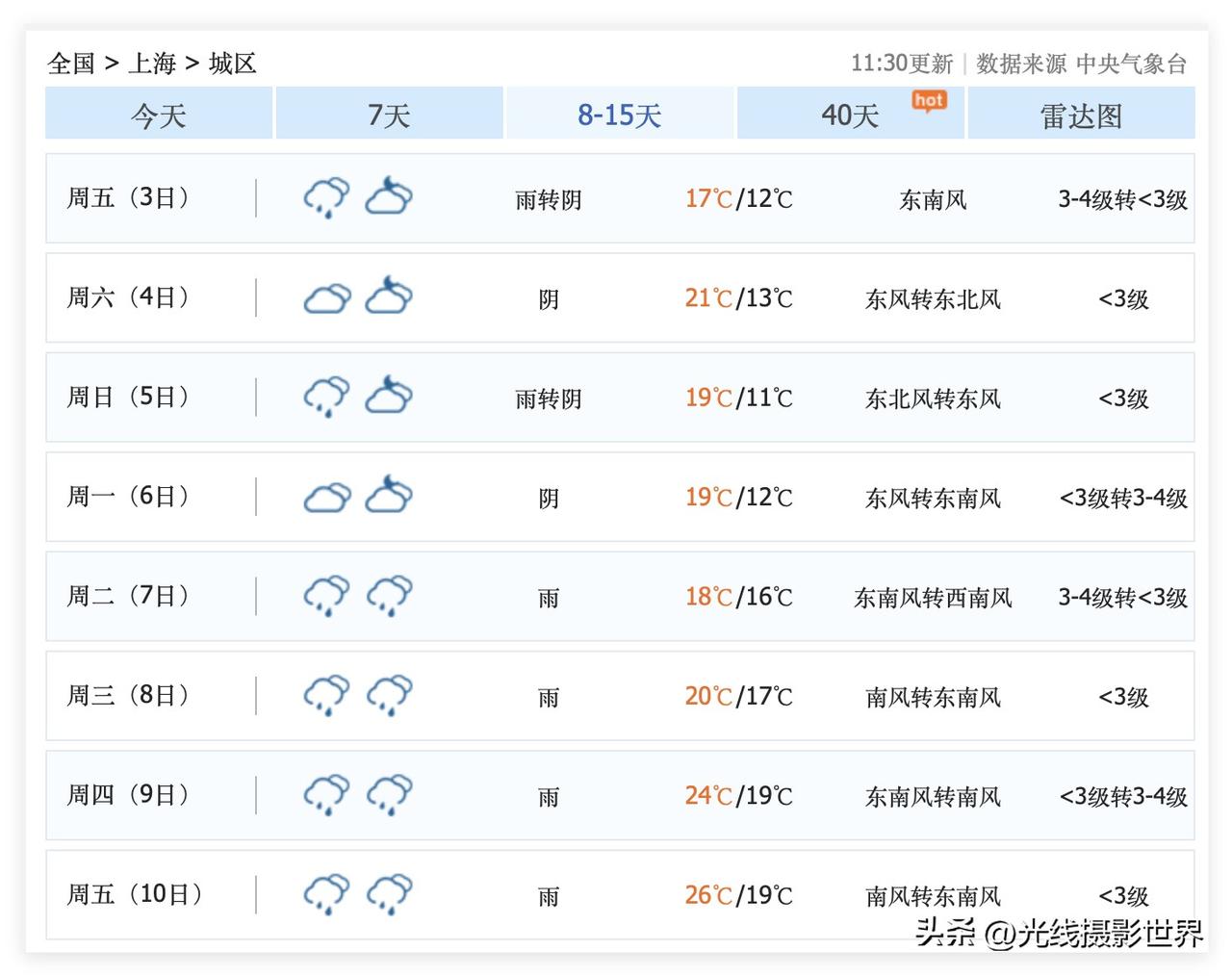 好难得哟!3月28日,星期六,上海要出太阳啦!但是,问题是,3月29日,星期天,上海阴转小雨……3月30日,上海中雨转阴……再接下来,中央气象台的最新天气预报显示,清明时节雨纷纷大概率会是这样的……阴雨天是主旋律,阳光比较稀缺……气温也比较凉爽,或者说,持续低迷…… 上海要迎来阳光灿烂的人间最美四月天,估计要4月10日以后……超级计算机认为,4月10日之前,上海经常下雨……大趋势可能就是这样吧。 总体来说,清明时节雨纷纷,最适合去广西桂林旅游,烟雨漓江,桂林山水美如画!