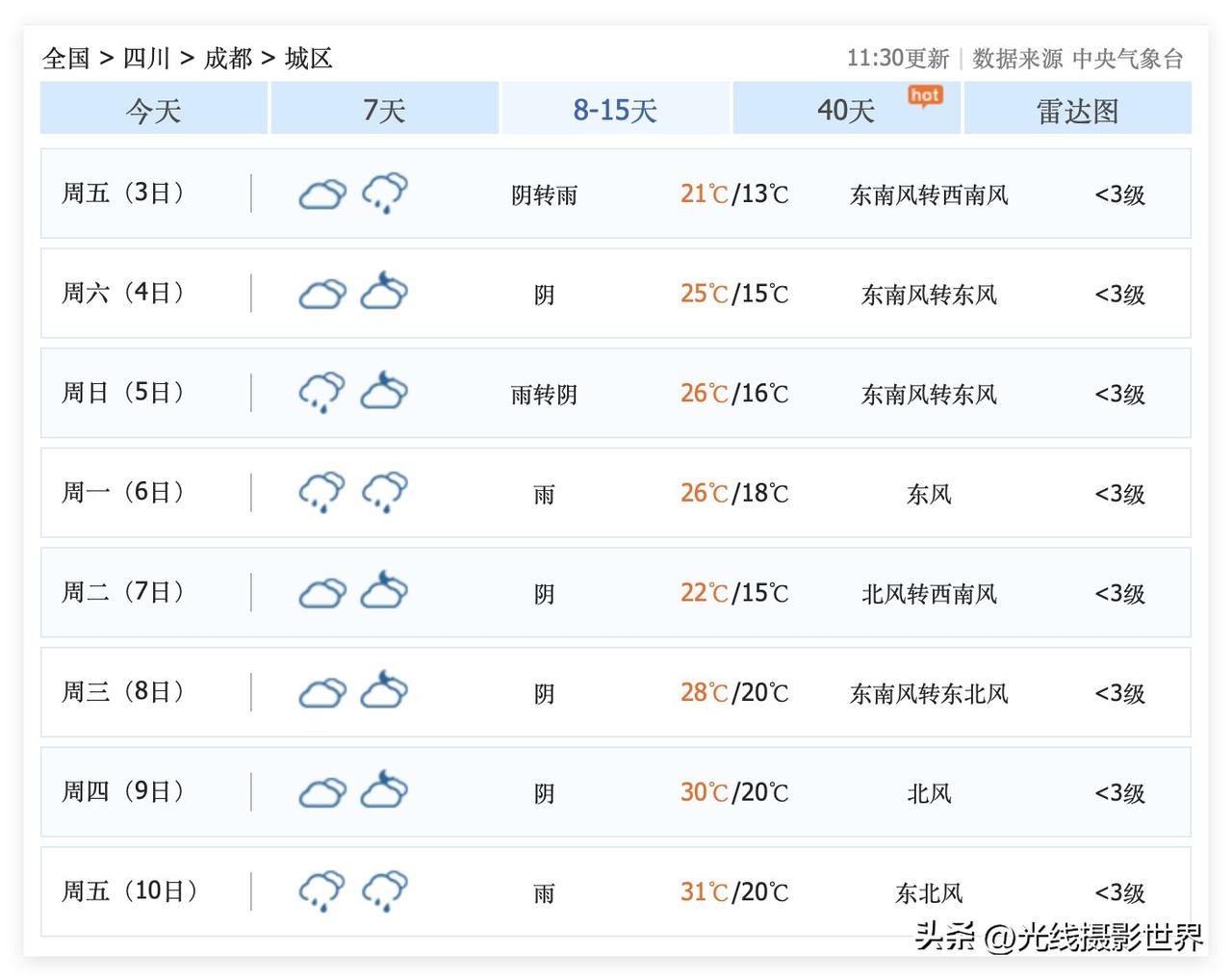 噢!这周末,四川省成都市,阴晴不定,有小雨!3月28日,星期六,成都多云转小雨……3月29日,星期天,成都小雨……2026年春天赏花高潮,这周末终于要结束啦!接下来,就是最美人间四月天啦! 春假,清明节假期,成都天气,好像是阴雨连绵,没啥阳光……中央气象台的最新天气预报显示…… 4月4日,星期六,成都阴天。 4月5日,星期天,成都雨转阴。 4月6日,星期一,成都下雨。 …… 不用看天气预报,大概也应该知道会是这样……毕竟是清明时节雨纷纷……所以,更加要相信中央气象台的超级计算机啦!