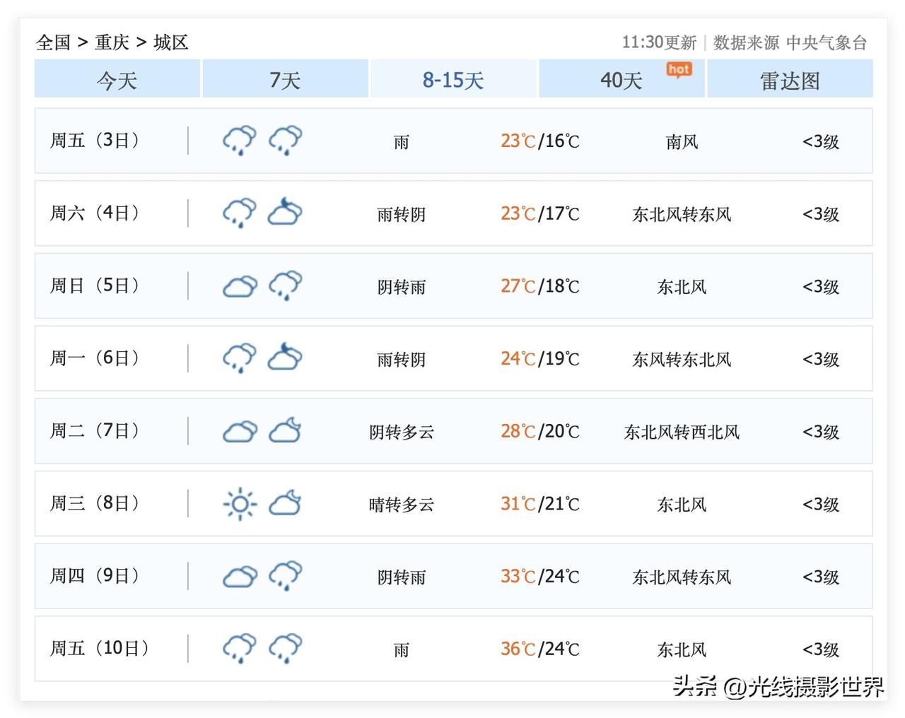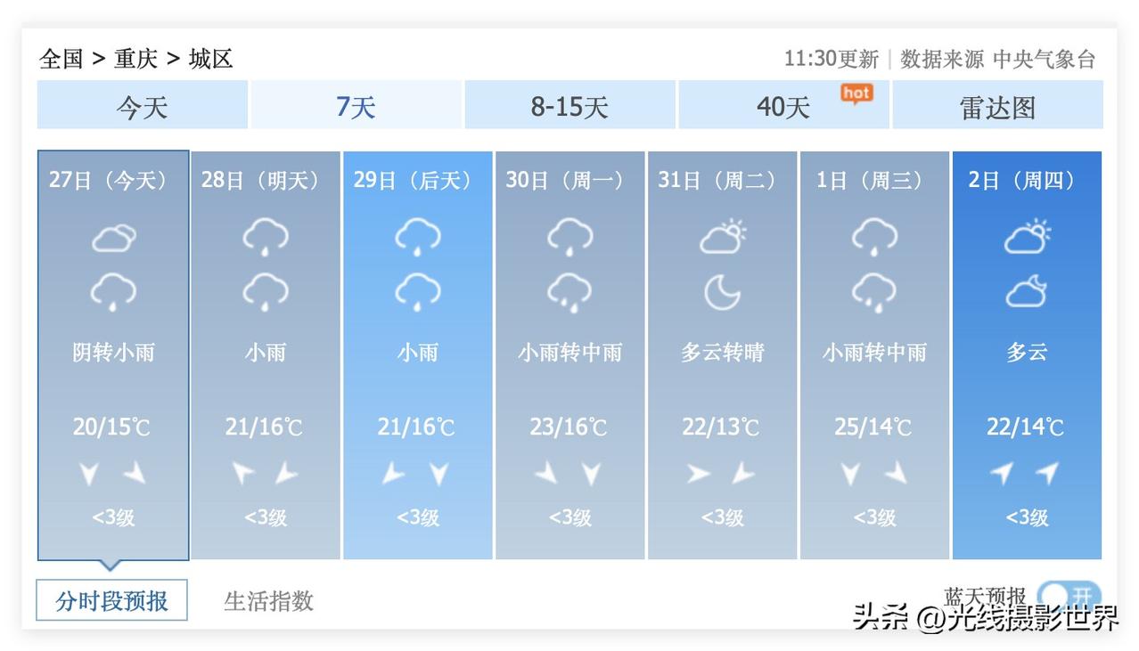 哎!3月最后一个周末,重庆要下雨啦!3月28日,星期六,重庆小雨!3月29日,星期天,重庆小雨……3月30日,星期一,重庆小雨转中雨……经过这三天的降雨……2026年春季重庆赏花高潮就彻底划上句号啦!接下来,只能说是清明时节雨纷纷……当然,4月,重庆还是有很多花可以欣赏,但是,并不是传统意义的春季的花啦! 好吧,中央气象台的最新重庆天气预报显示……未来10天半个月,阴雨连绵是主旋律,按照最近和多年的惯例,白天阴天,晚上半夜三更下点雨,偶尔出太阳……是主旋律。 只是,万万没想到,超级计算机认为,4月8日到10日,重庆主城区,要冲刺36度高温……