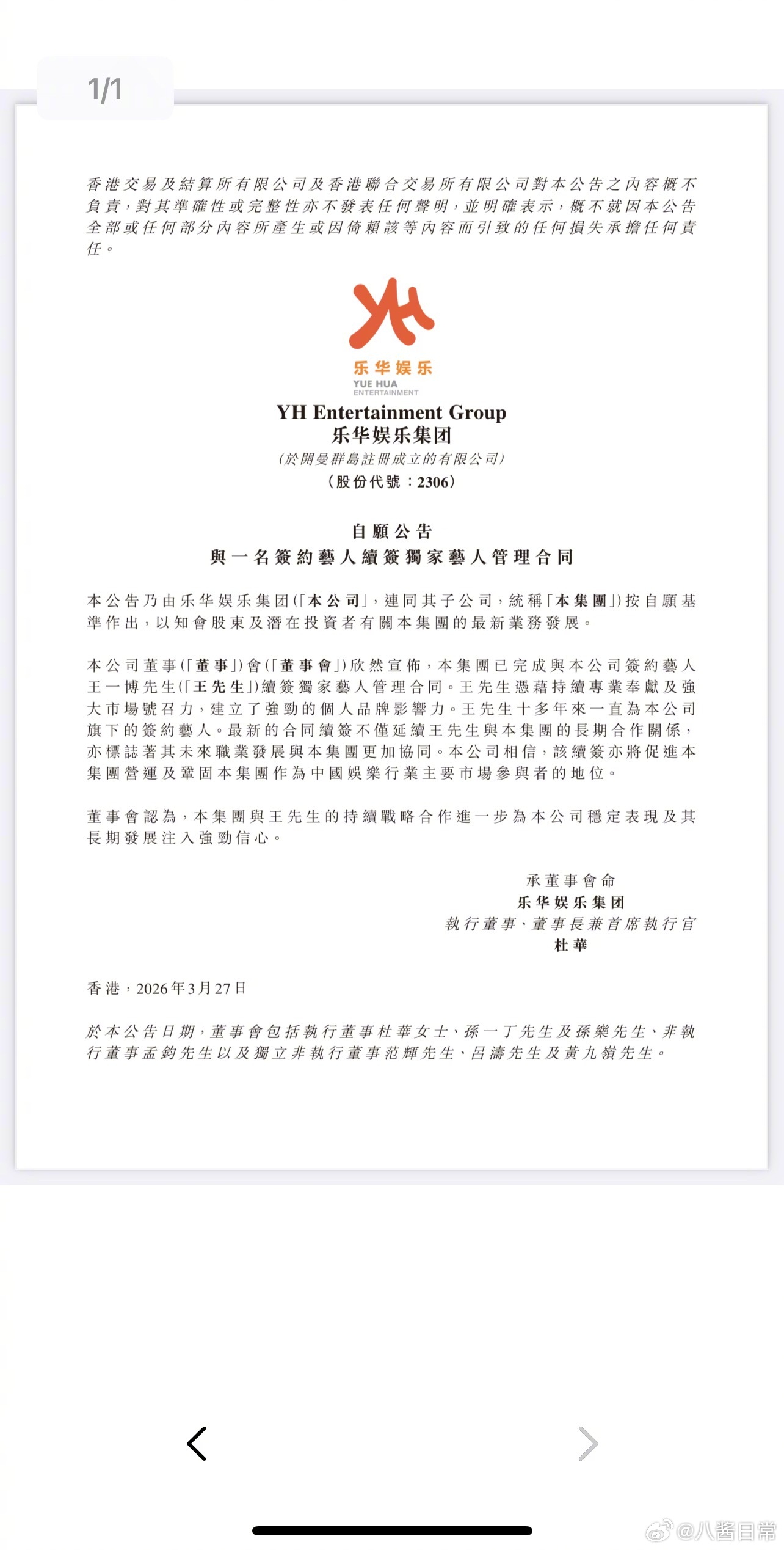 乐华娱乐官网显示,已完成与王一博续签独家艺人管理合同“最新的合同续签不仅延续王先