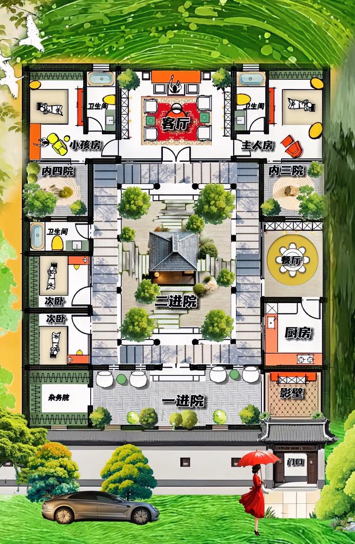 我相貌平平,居然是四合院的传人,304㎡没顶级的深度,却是一张人间烟火的布局! 单纯看格局,一进院太普通,二进院打扮得太耀限,三进院不霸道,却通风采光,四进院同理,打着一张天井牌,提供天然的情绪价值! 所以说自建房想不贬值,敢让门面担当影壁不走寻常路,留白一进院,也就是说敢浪费29㎡园子,做面子,要颜值! 一进院想活到极致,一半简与一半收纳! 你看二进院,就是活色生香,54㎡中院敢撒娇,有花有草陪亭阁,东侧保留火属性功能,餐厨一体化,西侧双套房面积不大,配合有厕所! 算是经典的合院风格,美到极致,保留人间烟花气! 而三、四进院其实是增值的10㎡天井,放在乡下,它是意境,能浪费的空间。放在城里,它是能扛事的落脚地,理解为私人领地! 所以你明白,一个自建房,不管的容貌、大小、格局,放在不同的地方,它都会随着时间贬值和升华! 不是福气!是给你找面子的! 合院的修为,布局想修炼好,三观正才是正道,30㎡堂房居中,采取中轴动线,才是真正的顶级平面高手。