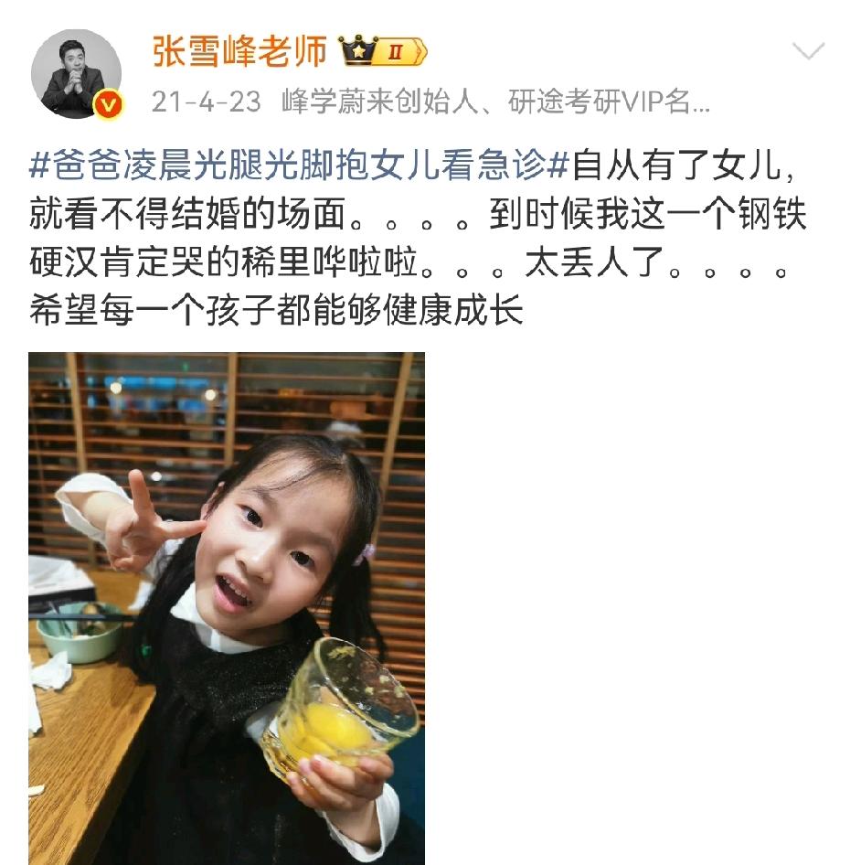 张雪峰女儿说:“谢谢叔叔,我爸爸很伟大,天上的文曲星换届,选中了他。” 看到张雪峰去世的消息我没哭,可当看到他女儿的这句留言时,我却落泪了!不得不说,张雪峰是个好老师,更是个好爸爸,他去世前,最放不下的肯定是他最爱的女儿吧! 如今他走了,此刻这个世界上最痛苦的绝对是,这个从此没有了爸爸的女孩……翻看张雪峰日常记录女儿的点点滴滴,只觉得好心酸,好难过...难怪他女儿的留言,会让无数人破防! 他总是念叨着,有了女儿不工作后,一定是陪小棉袄的;等女儿考大学,要给女儿报志愿;还看不得结婚的场面,等到时候自己这个钢铁直男一定会哭得稀哩哗啦的,太丢人了...却万万想不到,他们的父女缘分只有短短的10年! 对于他女儿张姩菡来说,从此再也等不到那个都会骑电动车接她放学的人;等不到那个说“爱她所爱,做她想做的事”,“我女儿在家里躺,她都有爹养”的人...明明才10岁的她此刻满心难过,却用着最稚嫩的语气,撑出了远超年龄的坚强,果然是“虎父无犬女”啊! 对于世人来说,张雪峰老师为寒门开智,为布衣引路,为草根点灯......却帮千千万万寒门学子,少走了许多弯路,相信这些福报都在他女儿身上,将来必定会有许许多多人出手护她一路坦途!