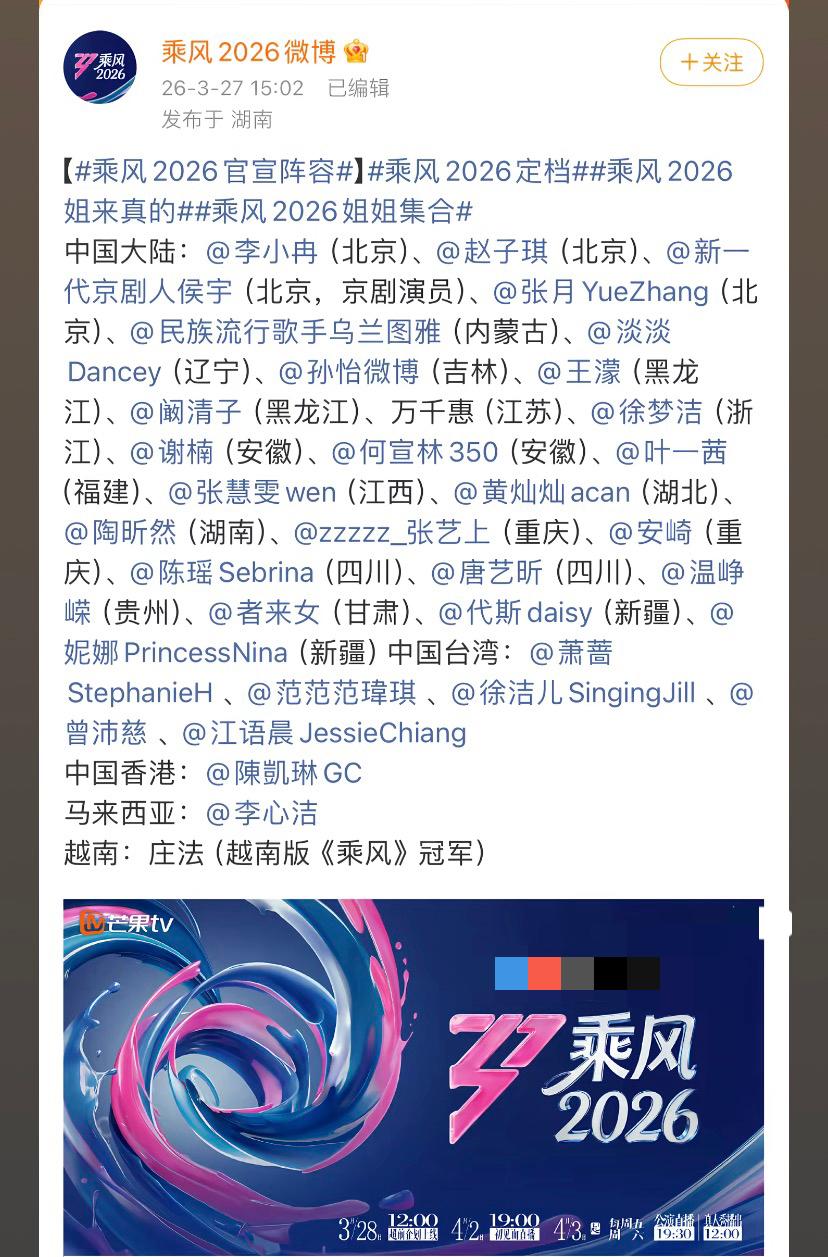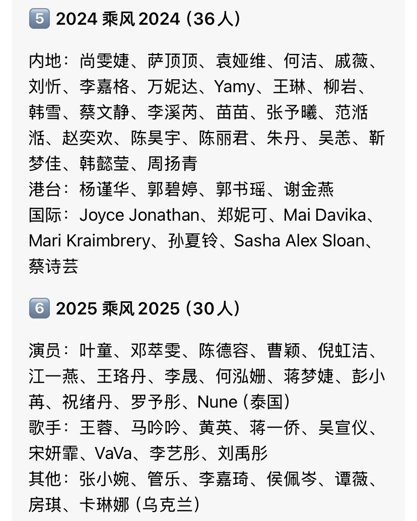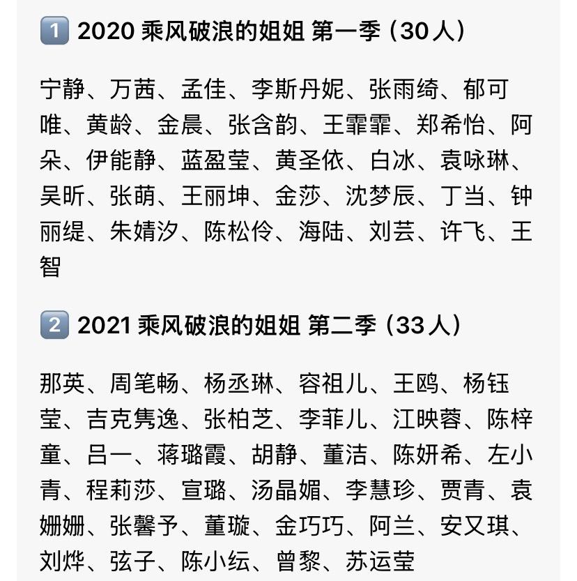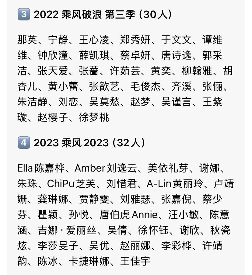 官宣阵容, 个人感觉会比去年有看点。 还有越南版乘风的冠军加入。 一共33位姐姐, 我比较期待乌兰图雅和王濛, 不知道会贡献什么名场面。 该节目今年是第七届, 我感觉去年第六届的阵容星味儿最小。 女明星真的很多啊, 都举办了这么多届了还能请到人。 以往的六届, 大家最喜欢哪一届, 最喜欢哪一个姐姐呢? 我最喜欢第二届,最喜欢杨钰莹。