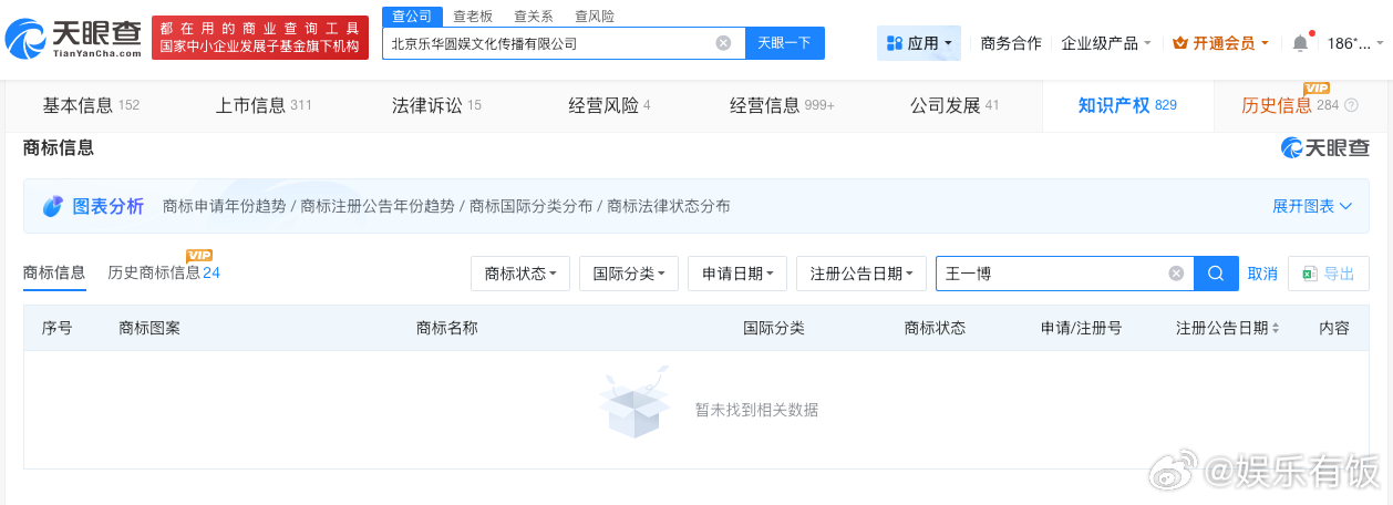 乐华未持有王一博姓名商标 据天眼查App显示,乐华娱乐关联公司北京乐华圆娱文化传