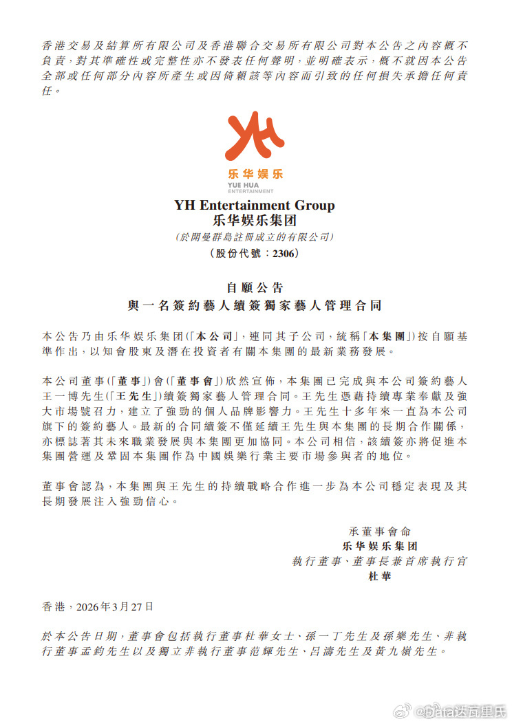 王一博已与乐华完成续约刚才粉丝说是P图造谣的看过来,是真的,不是P图。➡️网页链接我下午3点多翻乐华官网【公告及通涵】时只有一个26.3.27的澄清与公告,现在3.27已经有二个了……正是续约