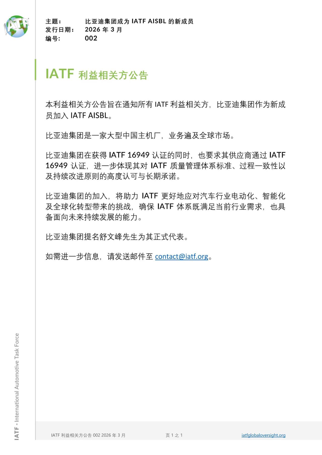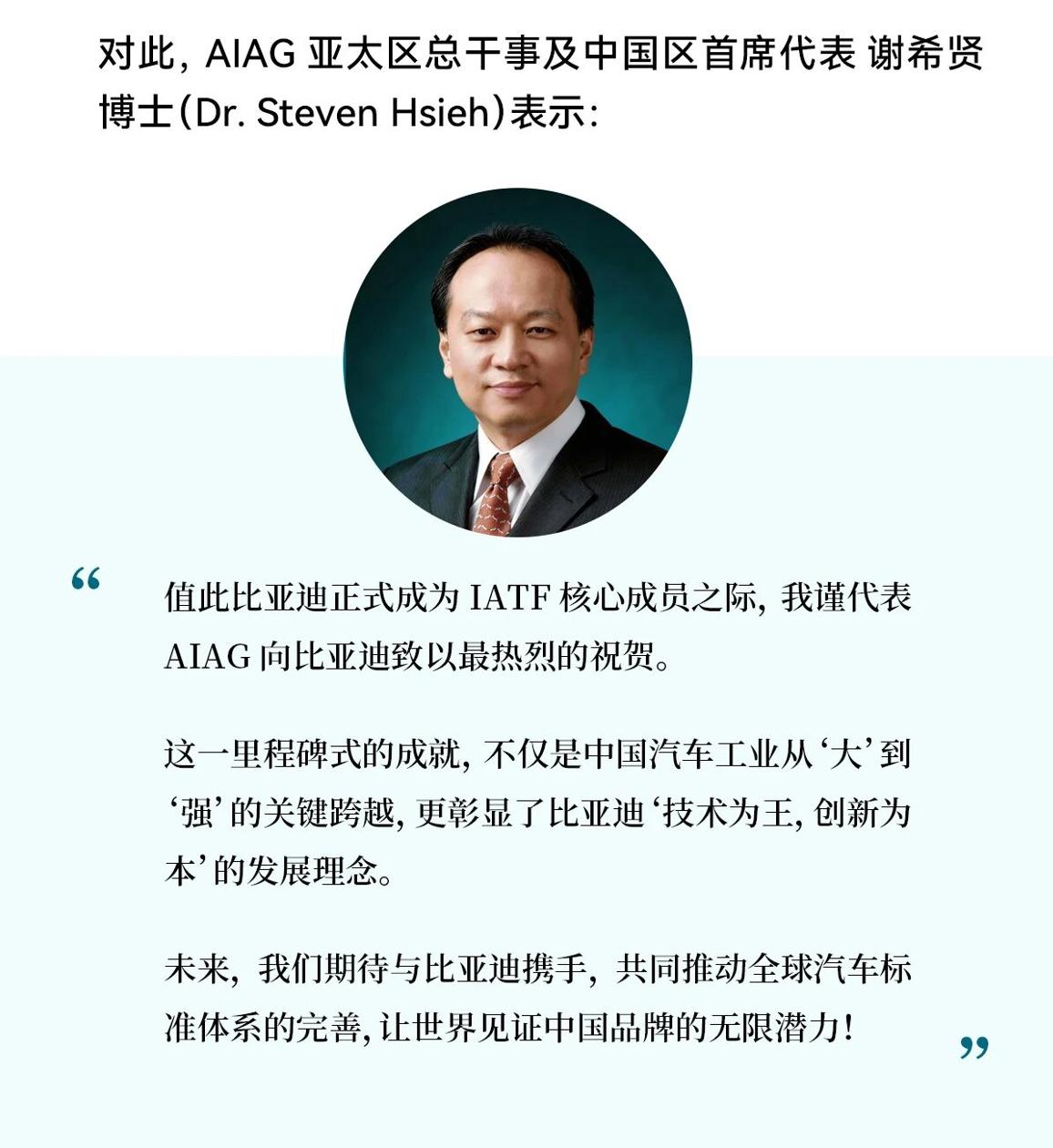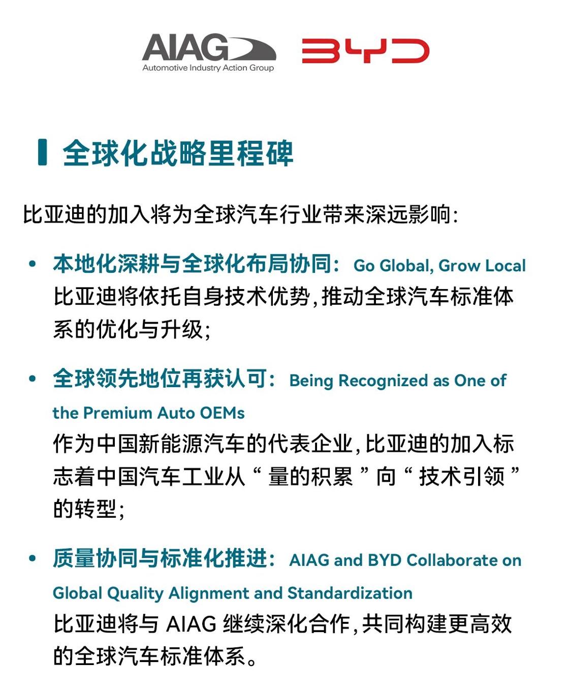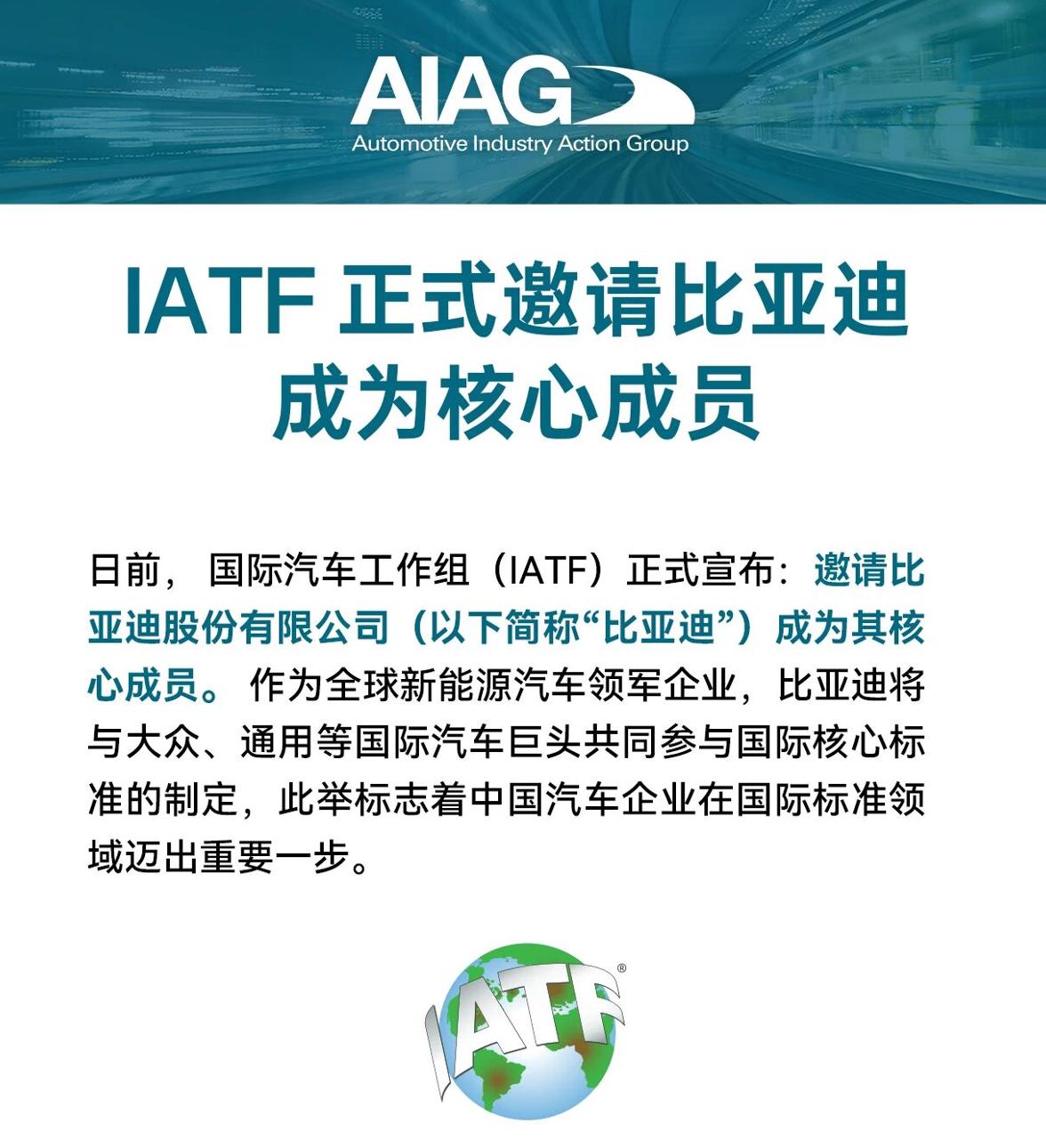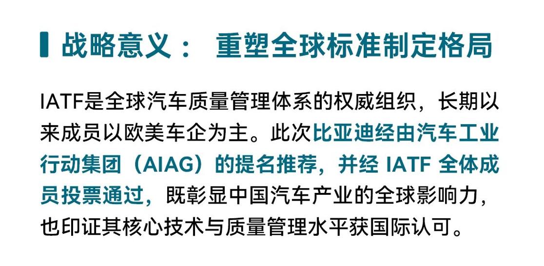 重磅!比亚迪加入IATF,与大众、通用共定国际汽车核心标准 2026年3月11日,比亚迪作为全球首个且唯一的新能源车企,正式加入国际汽车工作组(IATF),进入以西方为主导的国际汽车标准体系,成功跻身全球汽车核心标准制定阵营。 作为全球汽车销量TOP5的比亚迪,将与原成员共同执掌全球汽车质量管理体系的规则制定权。以比亚迪为代表的中国车企,正在不断改写全球汽车产业游戏规则,树立全球产业发展标杆。 IATF是全球最大的汽车行业协会,是质量管理体系的权威组织,长期以来成员以欧美车企为主,如宝马集团、福特汽车公司、通用汽车、大众汽车公司、沃尔沃集团等。 此次比亚迪经汽车工业行动集团(AIAG)提名推荐,并经IATF全体成员投票通过,既彰显中国汽车产业的全球影响力,也印证其核心技术与质量管理水平获国际认可。 IATF官方公告称:“比亚迪集团的加入,将助力 IATF 更好地应对汽车行业电动化、智能化及全球化转型带来的挑战,确保IATF 体系既满足当前行业需求,也具备面向未来持续发展的能力。” 比亚迪新能源汽车已远销全球110多个国家和地区,2025年全球销量超460万辆!3月5日,比亚迪又发布了“第二代刀片电池”及“闪充技术”,并宣布将于2026年底正式启动“闪充星球”计划,将闪充站建到世界各地。 在全球汽车产业加速向电动化、智能化转型的背景下,比亚迪参与国际汽车标准的制定与完善,将推动全球汽车产业向更加绿色、智能的方向迈进,为世界汽车工业发展做贡献。