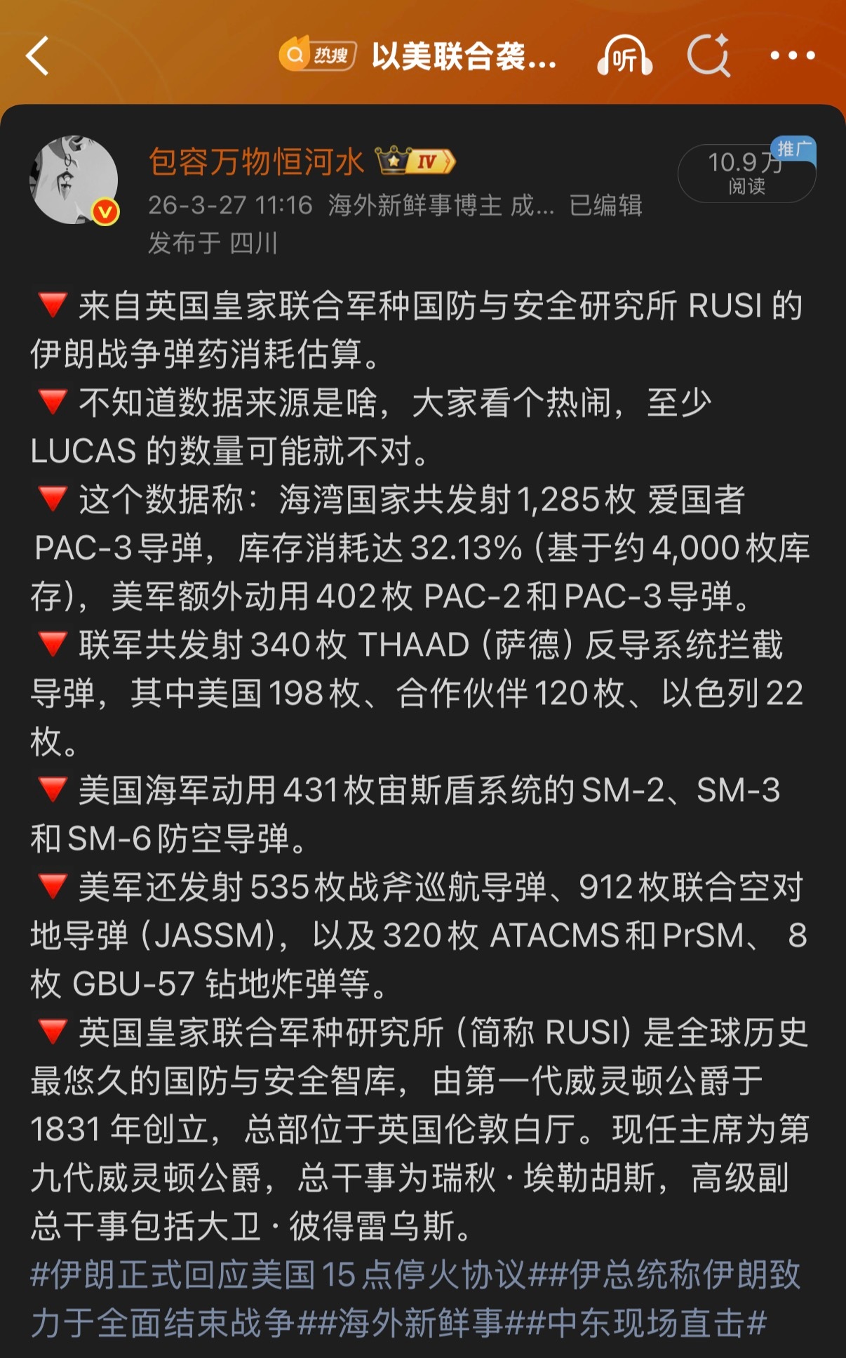 🔻大篇,感恩。🔻图2-3是英国皇家联合军种国防与安全研究所 RUSI 估算的前16天美以联军弹药消耗量。特朗普称与伊朗谈判顺利霍尔木兹海峡的最后通牒海外新鲜事中东现场直击