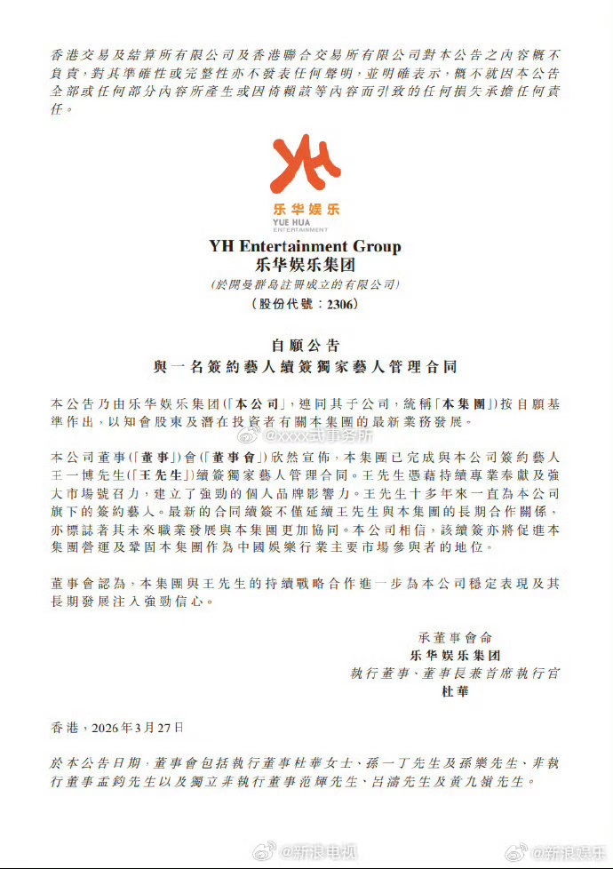 王一博乐华续约,乐华娱乐官网更新公告,宣布与王一博已完成续签独家艺人管理合同