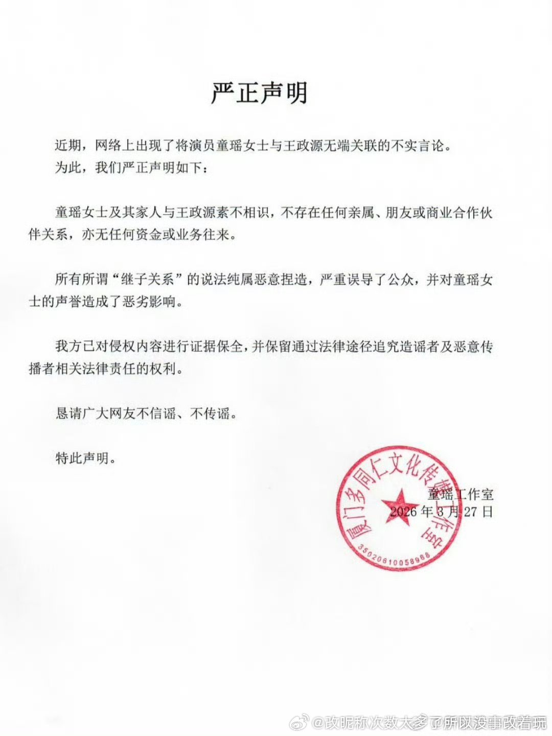 素不相识,所谓 “继子关系” 纯属恶意捏造,切双方无任何亲属、朋友、商业及资金往来。不管真假,声明起码是有力的王憋了半天,“与X小姐素不相识or仅为聚会见过几面的普通朋友关系,小某书的所有网传聊天记录均与王一B无任何关系,与X小姐所谓 “情侣关系” 纯属恶意捏造,王一B与X小姐双方无任何私下见面往来关系”,都骗不出来