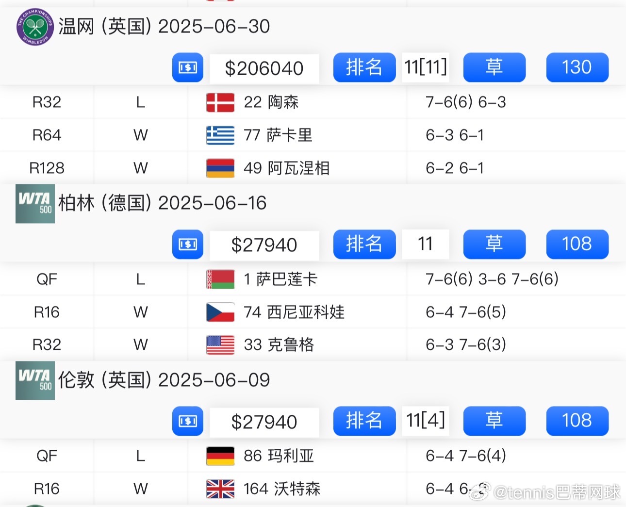 ⭐️草地赛季去年也是不愠不火,女王杯和柏林都是1/4决赛出局,温网更是在被看好的情况下第三轮负于陶森