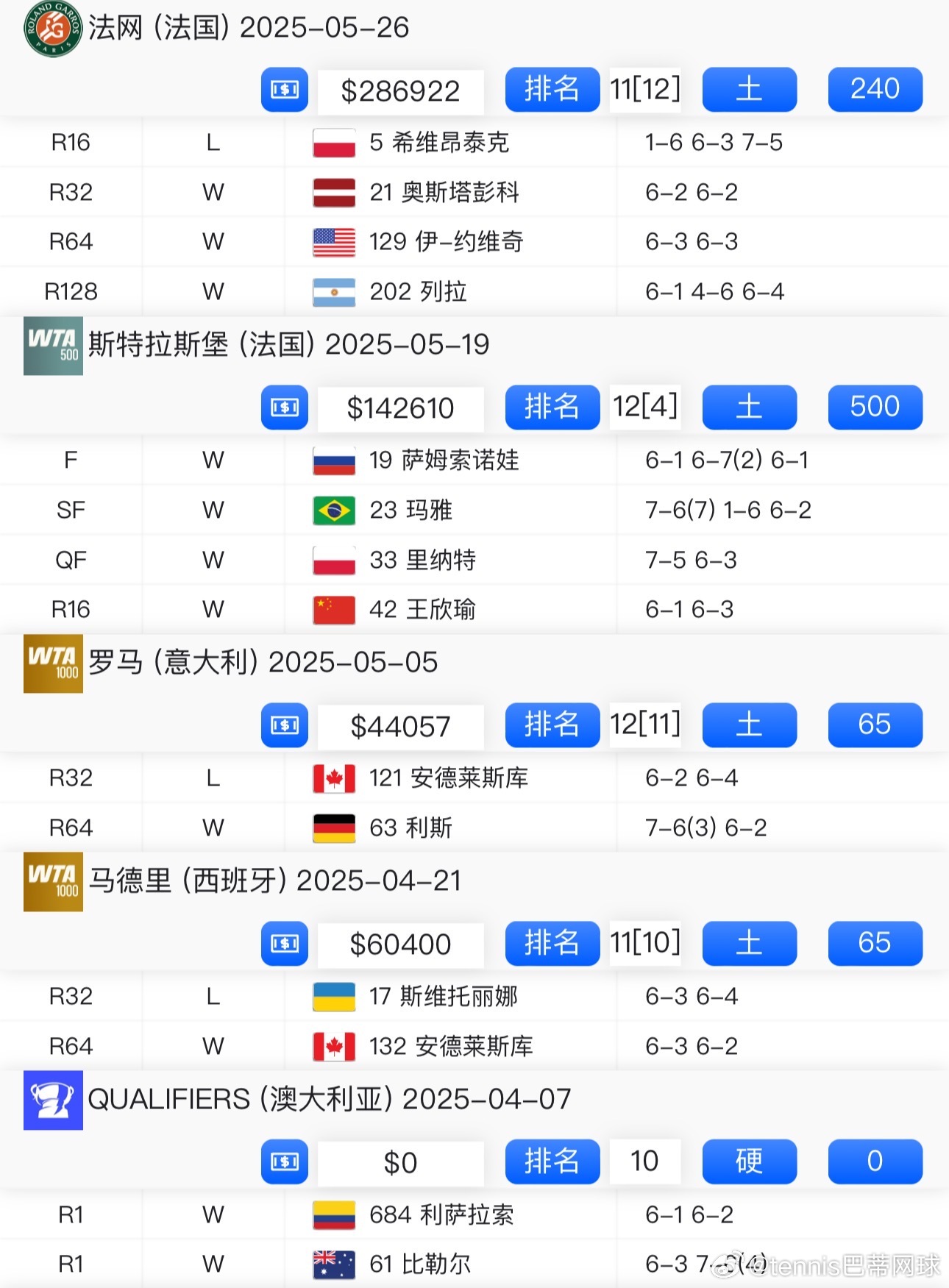 ⭐️去年参加比利简金杯错过了保时捷赛卫冕,不过又跑去参加了法网前一周的斯特拉斯堡,还打破了冠军荒;马德里和罗马去年都只赢一场,法网是第四轮;