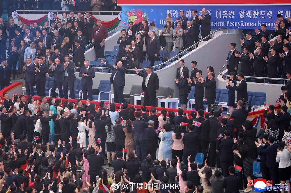 金正恩同志同卢卡申科同志步入观众席,全场观众以热烈鼓掌迎接。