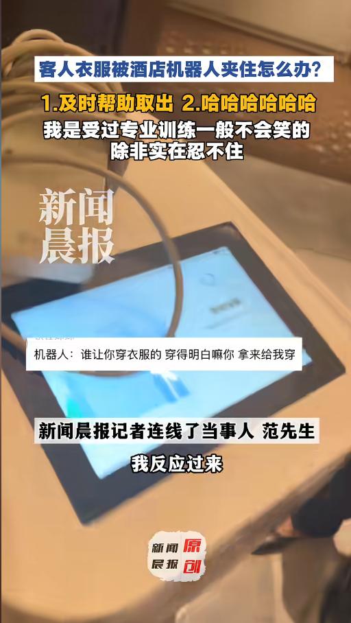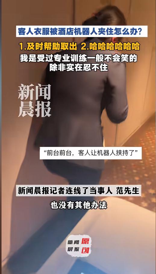 “没忍住笑出了鹅叫!”近日,山东,一男子在酒店要了个插排,酒店安排了机器人给送过来,没想到取的时候出现了意外。男子的衣服不小心被机器人夹住,怎么拽也拽不出来,无奈只能跟着机器人走,旁边的工作人员见到这一幕,笑的腰都直不起来了! 各种送餐机器人,服务机器人早已深入大众,普通的酒店饭店随处可见,由此也引发了不少问题。前有机器人上班发疯,这又来了一个“挟持”客人的。 据媒体3月25日报道,范先生住酒店的时候要了一个插排,工作人员找了个机器人送货。本该是取完货就行了,结果偏偏出了意外。取货的时候,范先生的衣服一角,被机器人给夹了进去,里面还有个钮,想拽都拽不出来。 无奈之下,范先生只能跟着机器人走,期待着遇着工作人员,或者到大厅给取下来。途中倒是遇见了一个,可是这个工作人员也是第一次见这种情况,根本不知道怎么处理。不仅如此,这工作人员还一直忍不住笑,腰都直不起来了。 一直到了电梯口,范先生才反应过来,自己没必要跟着机器人走啊,只要把外套脱下来,让工作人员跟着下去,再给自己送上来就好了。他这半天的洋相,是白出了。 网友看后表示,没啥大不了的,只是丢点脸,隔壁还直接被 机器人揍了呢!这还给大家带来了不少欢乐,范先生厥功至伟!提醒大家,机器人服务虽然便利,在使用的时候一定注意按规程来,保持好距离,千万不要被误伤了哦! 信息来源:《倒霉熊不是停播了么?客人衣服被酒店机器人夹住取不出,工作人员笑到直不起腰,客人:她已经尽力在忍了(记者:吴怡菲;视频:范不怂》新闻晨报