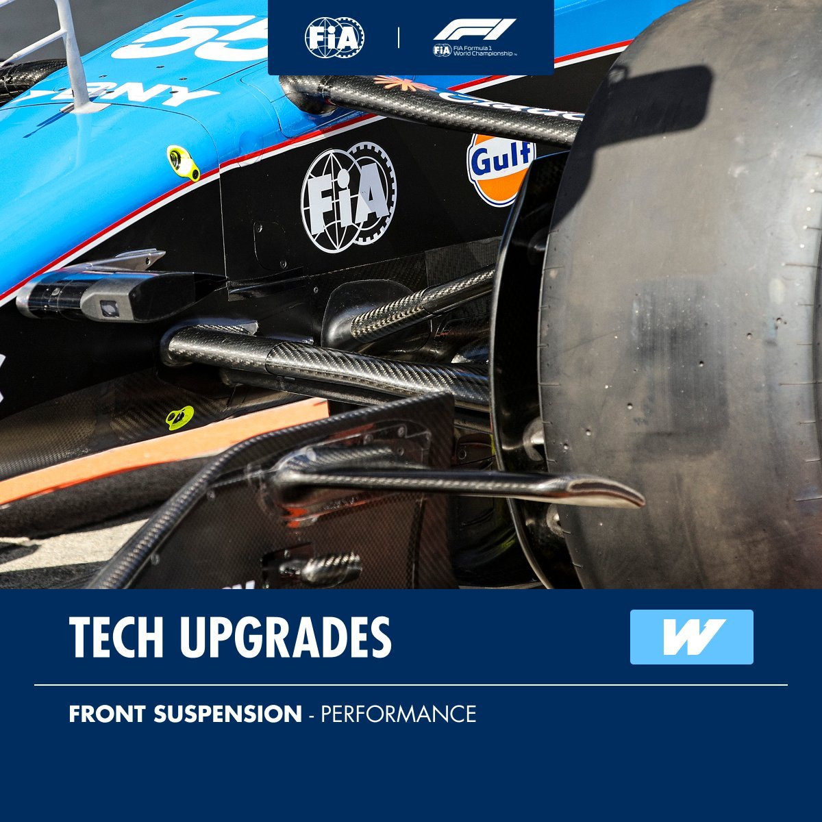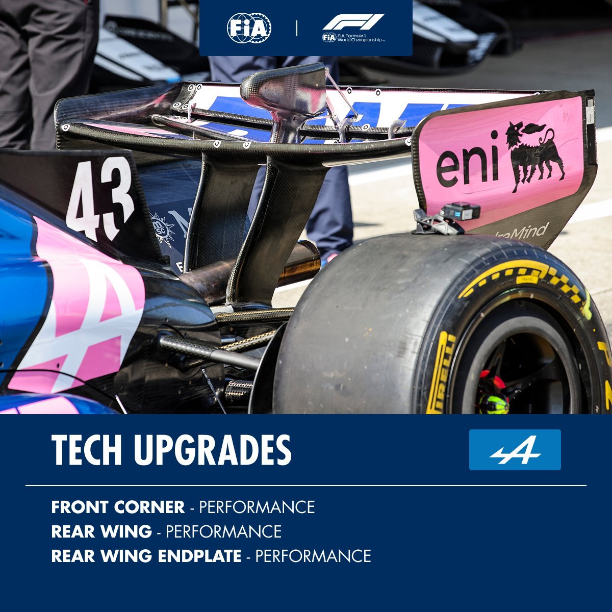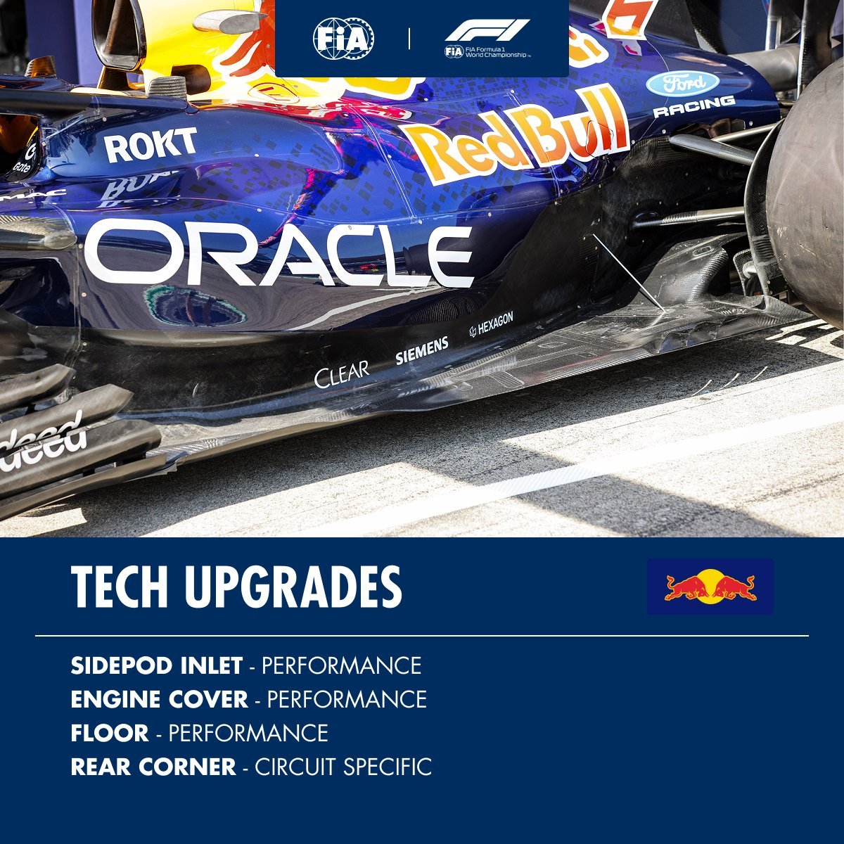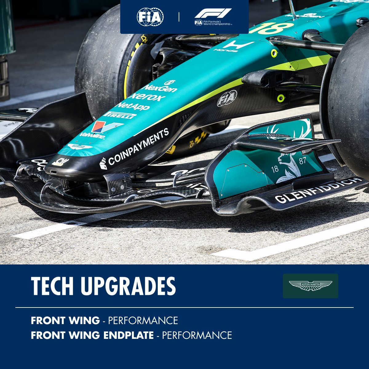 法拉利:前刹车导管、前底整流罩威廉姆斯:前悬架护板阿斯顿·马丁:前翼、前翼端板、底板红牛:侧箱、引擎盖、底板哈斯:前翼可动装置Alpine:前导流板、尾翼控制装置整流罩、尾翼端板凯迪拉克:扩散器、扩散器挡板