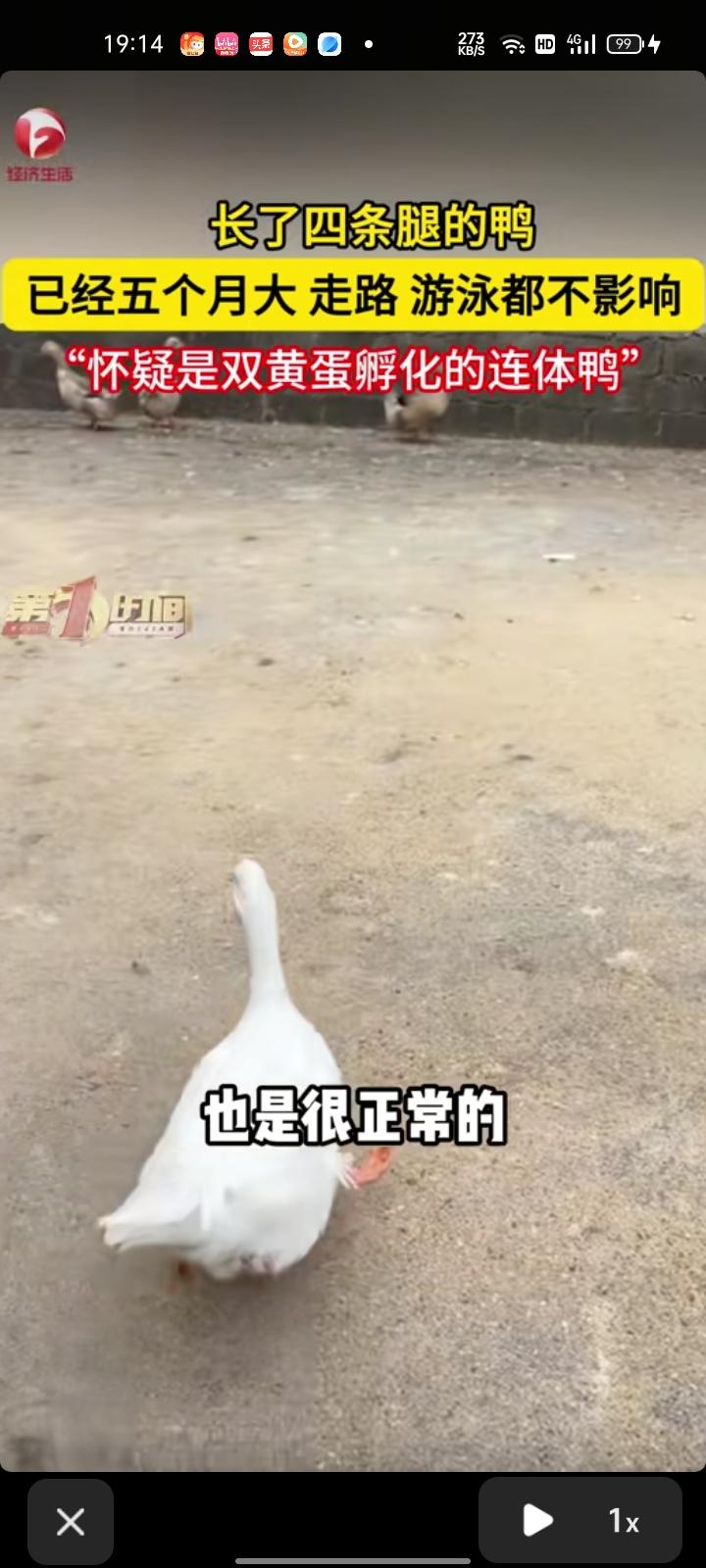 3月27日,赣州市大余县。女子晒出长了四条腿的鸭,鸭蛋孵化的时候就有四条腿,这种概率比较低,存活率也比较低。目前它已经五个月大,走路、游泳都不影响,和正常的小雅没什么区别,怀疑是双黄蛋孵化的连体鸭