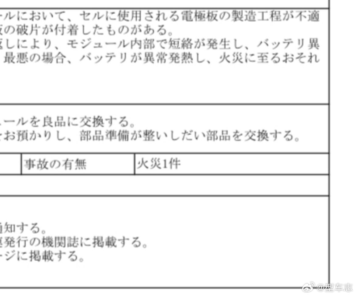 电池车的鼻祖 - 日产聆风Leaf,全新一代刚上市就被召回。由于电池制造工艺问题,电芯内部可能残留异物。反复充放电可能引发短路,异常发热甚至起火。解决方案是更换整个电池模组。