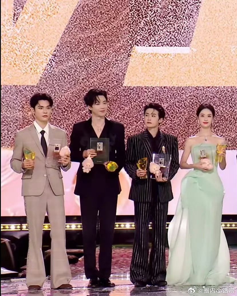 190cm的张凌赫,也穿上了高跟鞋。微博之夜,陈哲远、于适、邓为,四个帅哥站一排