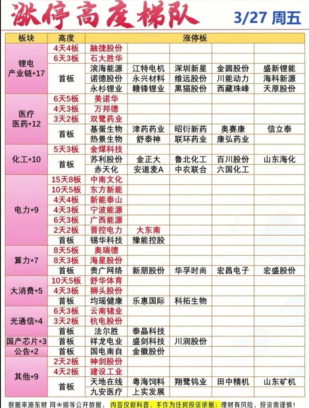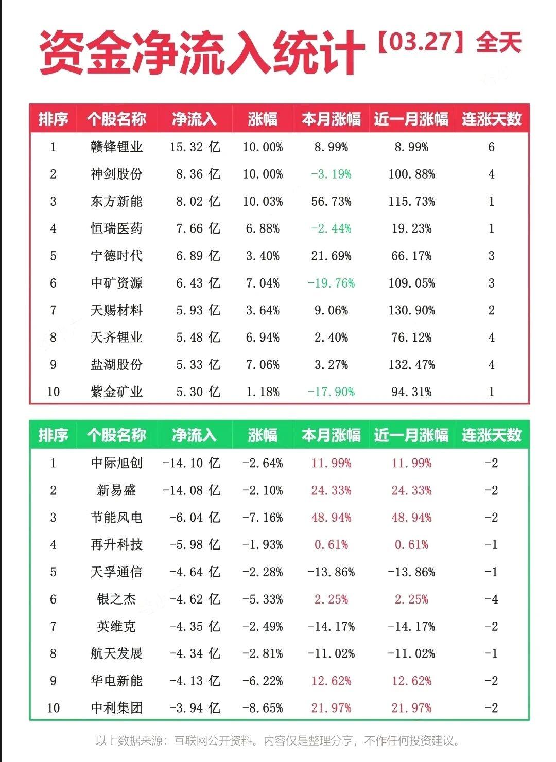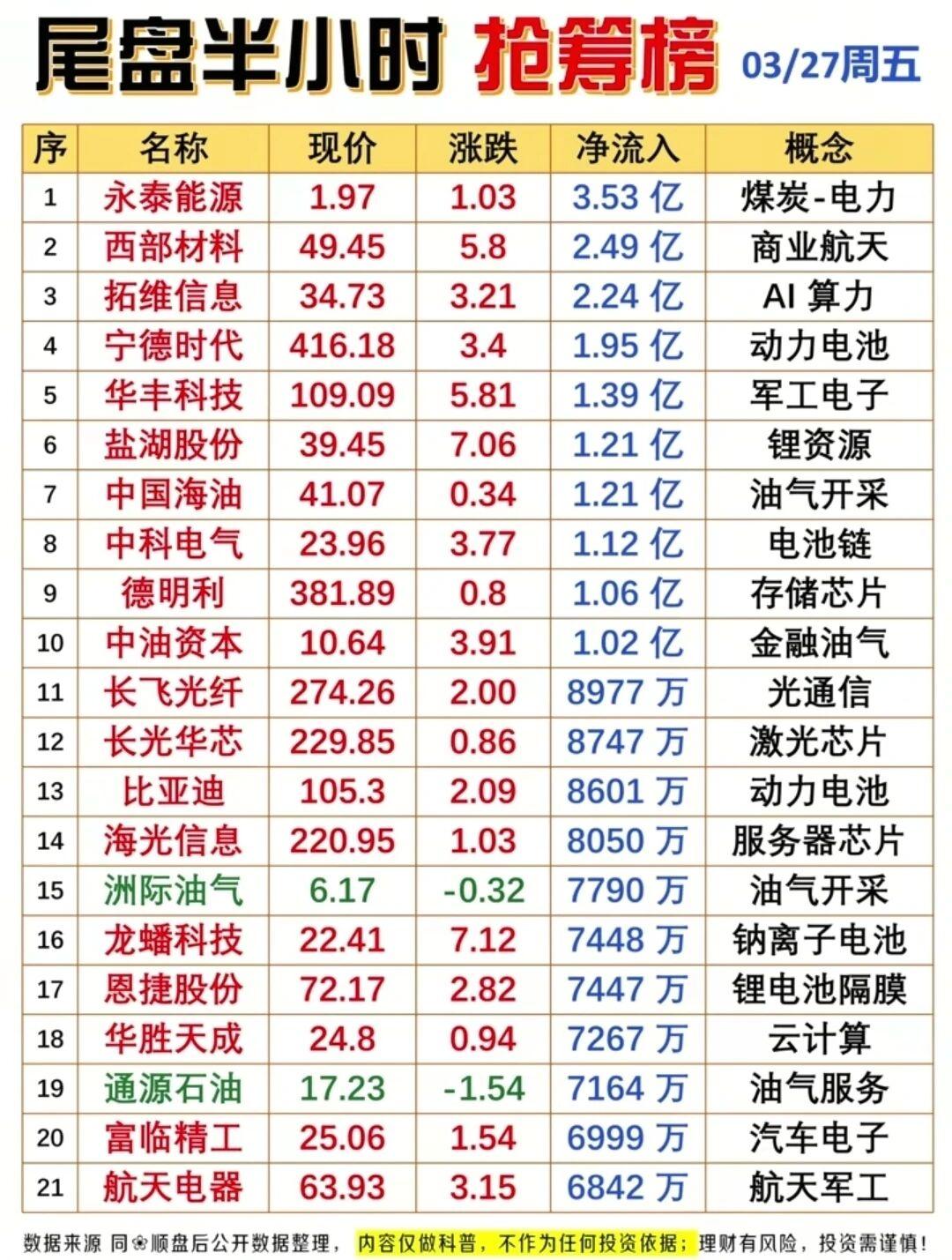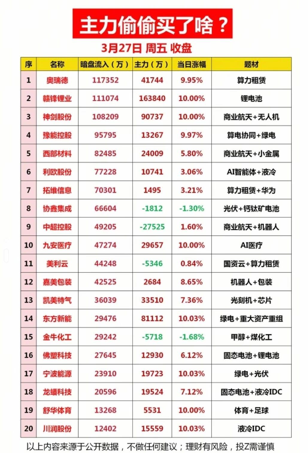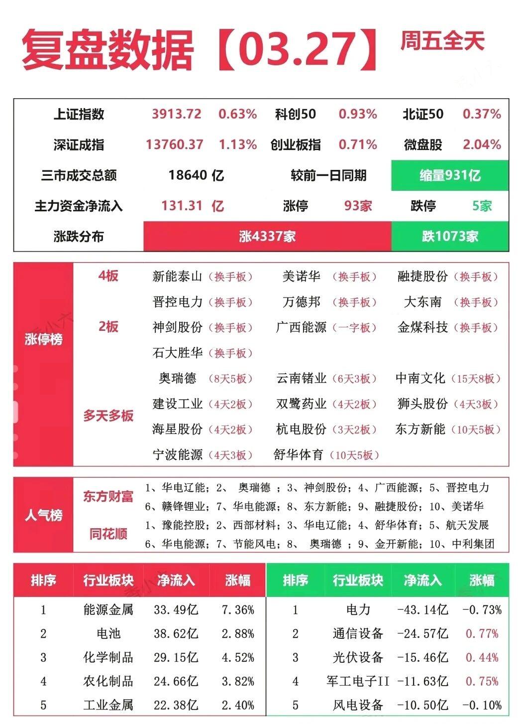 3月27日周五A股游资龙虎榜+盘面核心看点复盘整理! 周五三大指数低开高走集体收涨!两市缩量至18640亿,主力资金净流入131.31亿,超4300家个股上涨,市场情绪回暖。 游资大佬动向:章盟主重金押注赣锋锂业、广西能源;呼家楼狂买西部材料4.59亿;多路资金围猎东方新能、九安医疗等热门标的,拉萨家人们则在多股做T。 尾盘抢筹榜:永泰能源、西部材料、拓维信息领衔净流入,煤炭电力、商业航天、AI算力成资金偏好方向。 涨停梯队:锂电、医药、电力、算力等板块多点开花,融捷股份4板、美诺华6天5板、东方新能10天5板,短线情绪活跃。 ⚠️数据仅供科普,不构成投资建议,理财有风险,投资需谨慎!