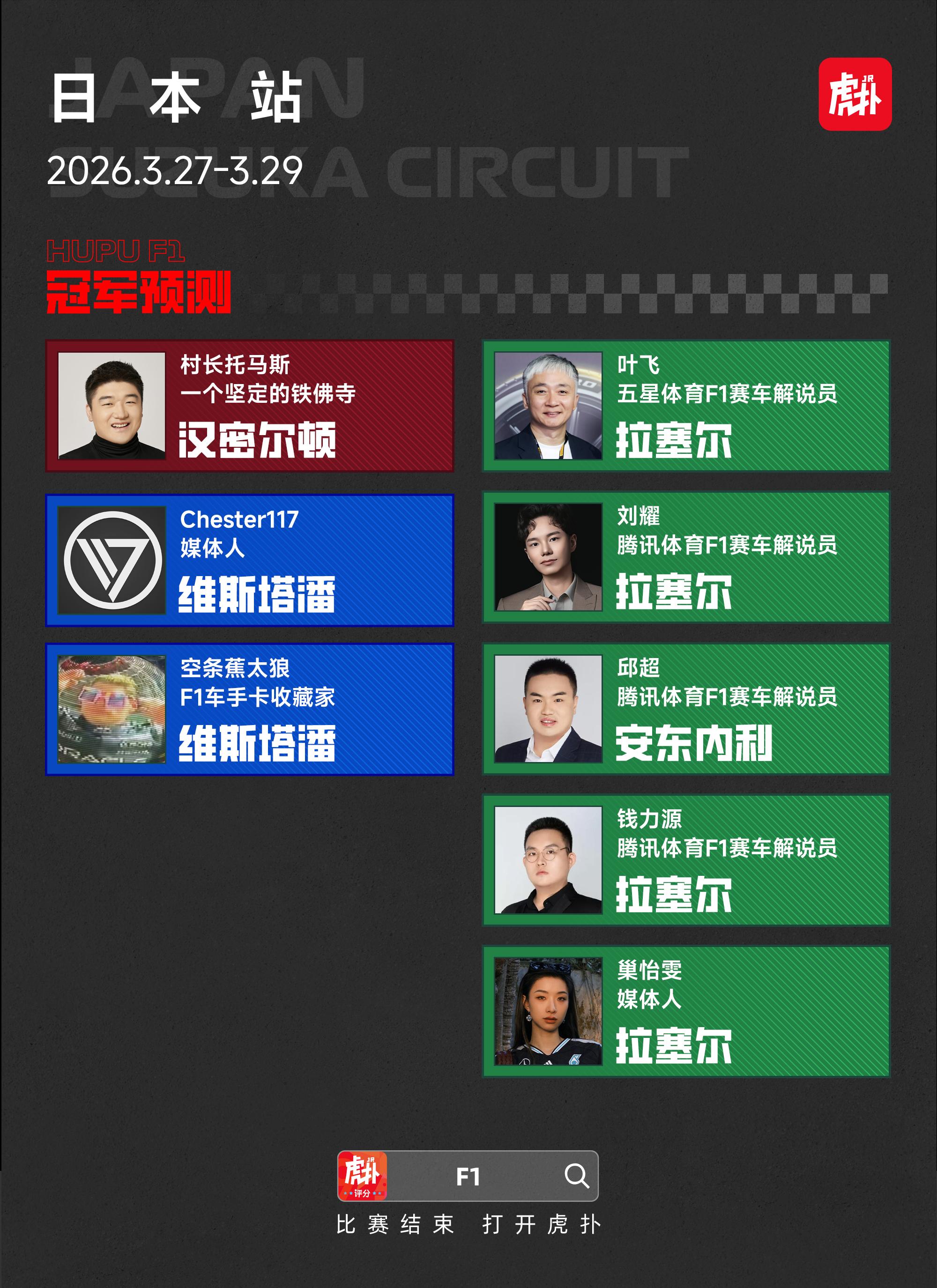 虎扑官方特意邀请了八位国内知名媒体人进行日本站正赛的冠军预测。其中5人相信梅赛德斯会继续辉煌,两人认为维斯塔潘会继续其在铃鹿的统治力,一人则猜测汉密尔顿将拿下冠军。