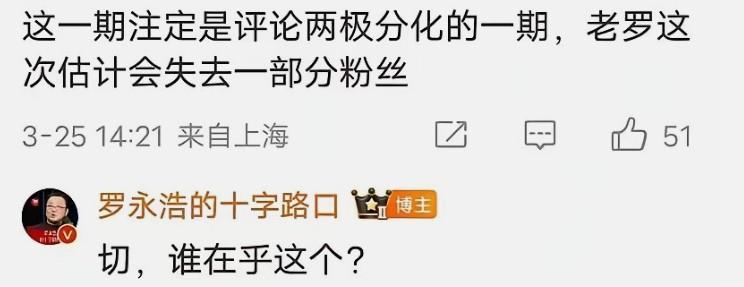 老罗现在的一切行为都可以在辛巴身上找到对照。 最讨厌他这种吃着粉丝的饭,反而说粉丝有问题! 直播带货,不怕名声差,怕的是没曝光,没流量。不隔三差五出点儿幺蛾子,直播间的流量怎么维持? 他的回复大多包括人身攻击,这是公众人物该有的说话方式吗
