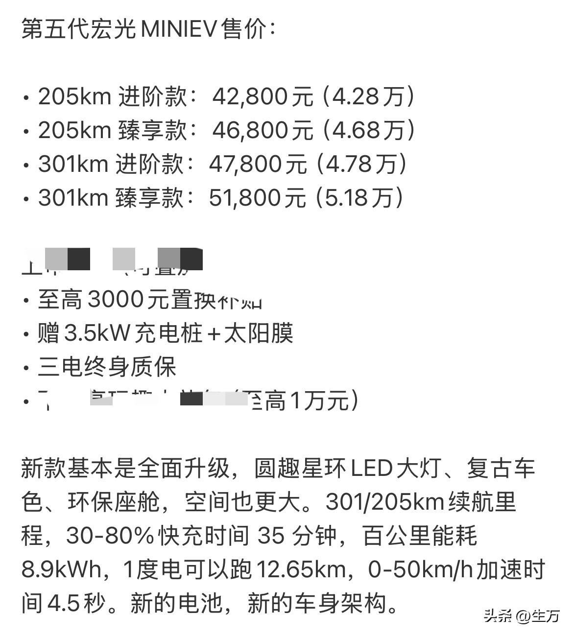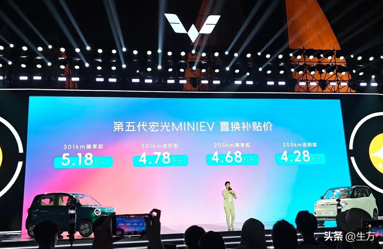 4.28万,第五代宏光MINIEV来了! 就在刚才,十分低调的五菱宏光,发布了他们的第五代小车:五菱宏光mini EV,起价4.28万! 要知道,五菱宏光新能源在走性价比这条路路上路,可以说是长大的甜头,因为他们的新能源代步车卖出出来超过258万台,而仅仅就是这一款五菱宏光mini EV版本,到今天为止已经卖出去190万台! 这个车这个车从第一代到现在,为什么有这么稳定的销量,有人说可能就是他便宜,毕竟第一代出来的时候好像也才三万多块钱,甚至现在去买买的话可能会更便宜,但是人家就是这么多年更新迭代过来了,一代一代的现在都来到了第五代! 所以可想而知,好多用户应该就是以前的用户置换过来的,所以这个车现在要做到,虽然看起来比较小,但里面的空间还要不拥挤才行! 这还仅仅只是看上去,而开起来与以前的区别也是蛮大的,这么小小的一个家伙居然能做到4秒多破百、1度电就可以跑12.65km,而快充也只需要35分钟,虽然这个数据与同行相比,确实还是差一点,但是人家这么便宜,这个时候这就不是一个缺点了[捂脸] 所以这一代相比前面几代,他在做工上面确实还是有不同的,比如他用了60%的高强钢,而且还与时俱进地加入了AI安全守护,作为一个入门级别的代步车,他各种颜色配置花样,可以让大家选。 而且还弄了好几个版本,不知道老用户看了之后会不会心动,毕竟他之前的用户基数有这么大,只要能够打动这部分用户,就算是稳了。