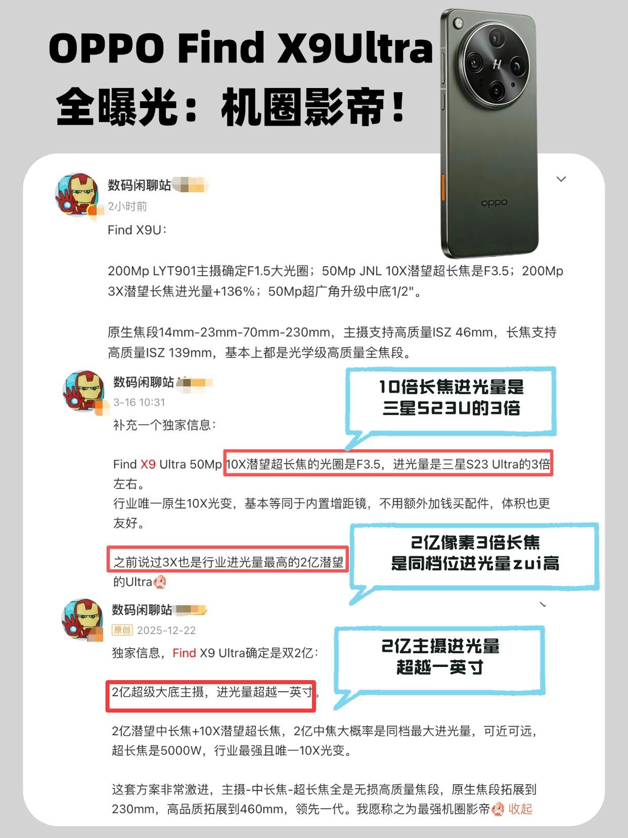 OPPO不讲武德!Find X9U简直就是相机平替 Find X9Ultra的影像配置基本是曝光了,2亿像素主摄的进光量比一英寸还高,2亿像素中长焦是同档位尺寸zui大、进光量zui大的(提升136%),10倍光变长焦更是强,进光量是10倍光变「神器」三星S23Ultra的3倍,超广角和丹霞镜头也有升级,五摄全是高规格镜头,怪不得有人说像口袋哈苏+手持哈勃,这影像确实能对标相机了。 - 目前10倍光变长焦的能力曝光了,照片还是视频的画质都是比传统10倍数码变焦好不少,我还看到广东卫视有一篇报道提到了Find X9Ultra,10倍光变的加入很像是给手机内置了增距镜,在演唱会租机市场预计会很火,多位租机行业老板据说已经去谈了合作,纷纷爆赞Find X9 Ultra。 - 要知道这是一台便携的手机,以后看演唱会带个小手机就ok了,追星族不用租相机、租增距镜等等咯!OPPO Find X9 Ultra快发吧,别涨价太多就好 - 哈苏相机 相机 手机拍照 OPPO OPPOFindX9Ultra 手机影像 拍照 演唱会手机