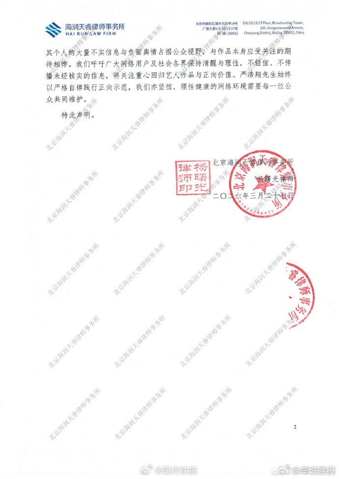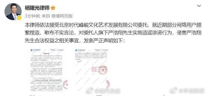 【#严浩翔方最新律师声明#】#严浩翔方已对多平台用户取证#3月27日,发文:本律师依法接受北京时代峰峻文化艺术发展有限公司委托,就近期部分网络用户频繁捏造、散布不实言论,对委托人旗下严浩翔先生实施造谣诽谤行为,侵害严浩翔先生合法权益之相关事宜,发表严正声明。(现代快报)戳更多>>#Angelababy韩安冉同框##曝关晓彤喜提新车##张杰把火车开进鸟巢了##脱粉##严浩翔#(编辑:郑宗敏;审签:谢杨柳)