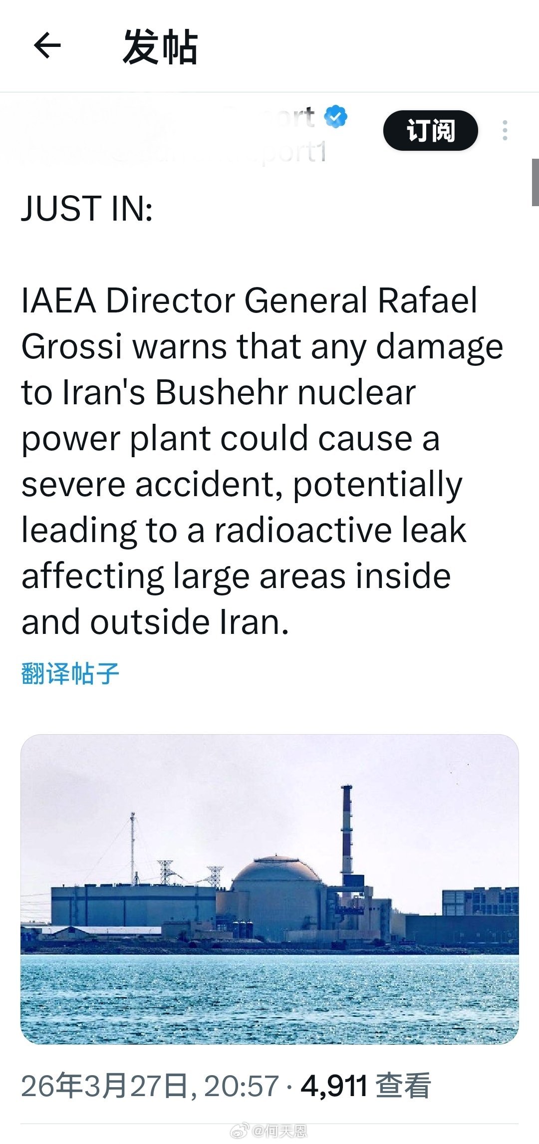 最新消息:国际原子能机构总干事拉斐尔·格罗斯伊警告称: