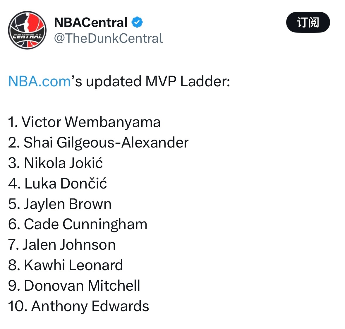 惊天巨变!MVP榜单文班亚马反超亚历山大,排名第一! 东契奇排名第四。
