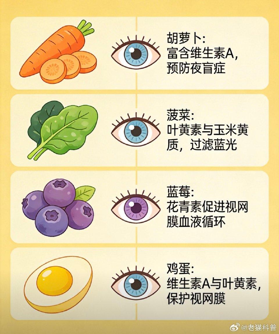 别再只靠眼药水!这4种家常食物,吃对了给眼睛“上保险” 天天刷手机、盯电脑,眼睛干涩又疲劳?其实日常吃对食物,就能悄悄给眼睛补营养,比眼药水还管用! 这4种食物是护眼界的“明星选手”: - 胡萝卜:富含β-胡萝卜素,能在体内转化为维生素A,保护视网膜、预防夜盲症,让眼睛在暗处也能看得清。 - 蓝莓:花青素含量拉满,能促进眼部血液循环,缓解用眼疲劳,还能延缓眼睛衰老,追剧党必备。 - 菠菜:含有叶黄素和玉米黄质,像给眼睛戴了层“天然墨镜”,能过滤手机、电脑发出的有害蓝光,减少视网膜损伤。 - 鸡蛋:蛋黄里的维生素A和叶黄素双管齐下,既能维持角膜健康,又能保护视网膜,每天吃一个,护眼又补营养。 护眼不用花大钱,把这些食物加进一日三餐,坚持吃,眼睛清亮又舒服,上班族、学生党快收藏!