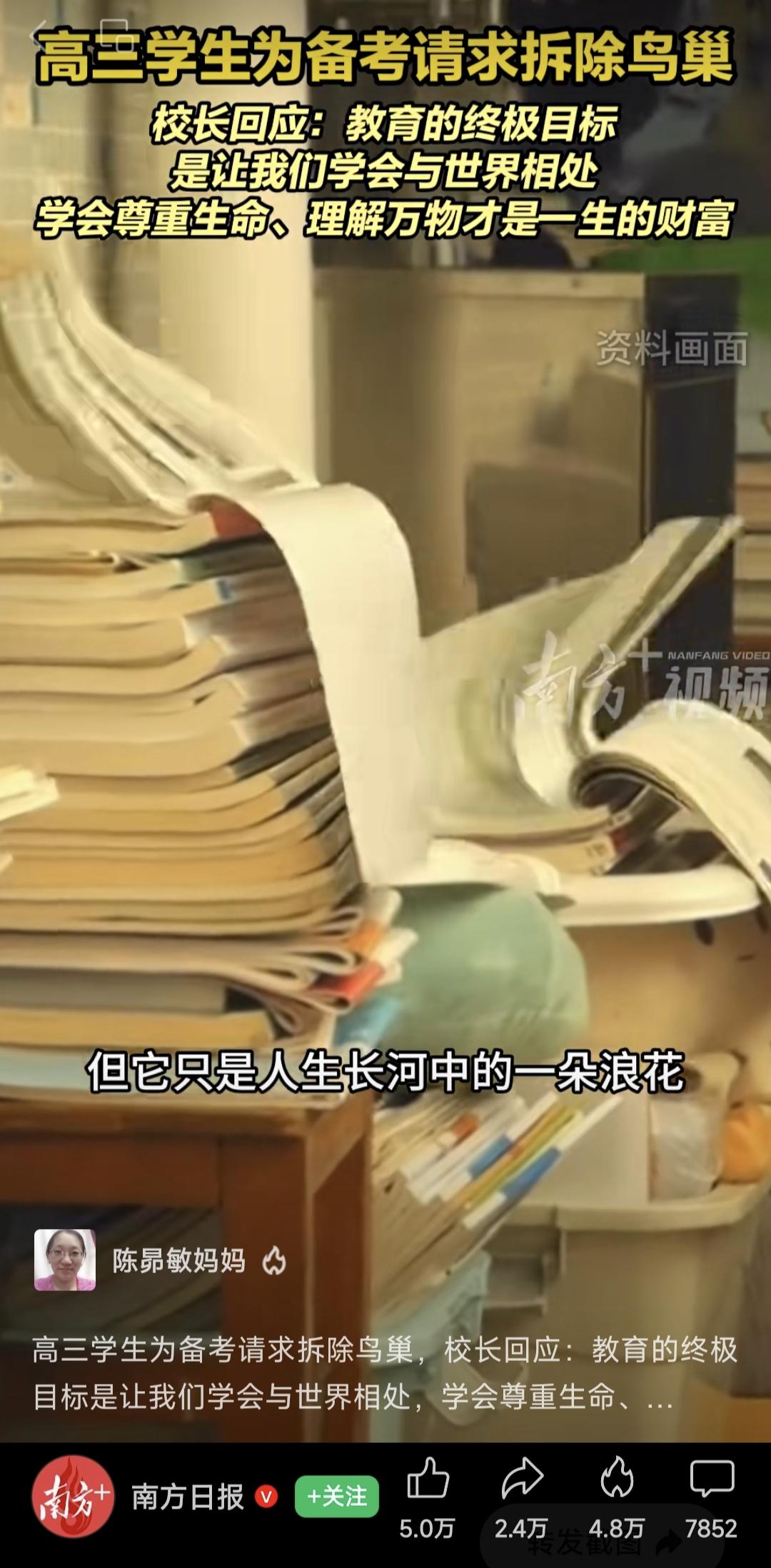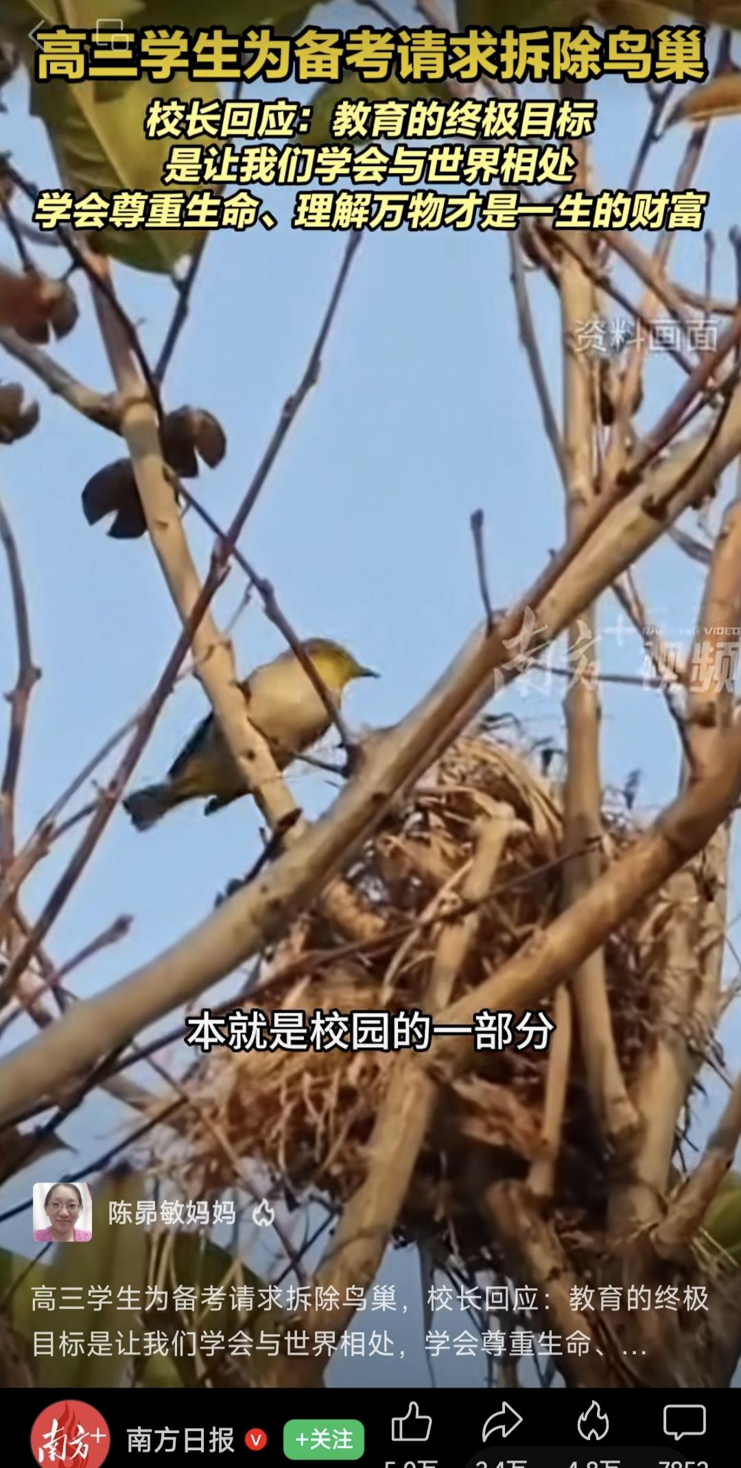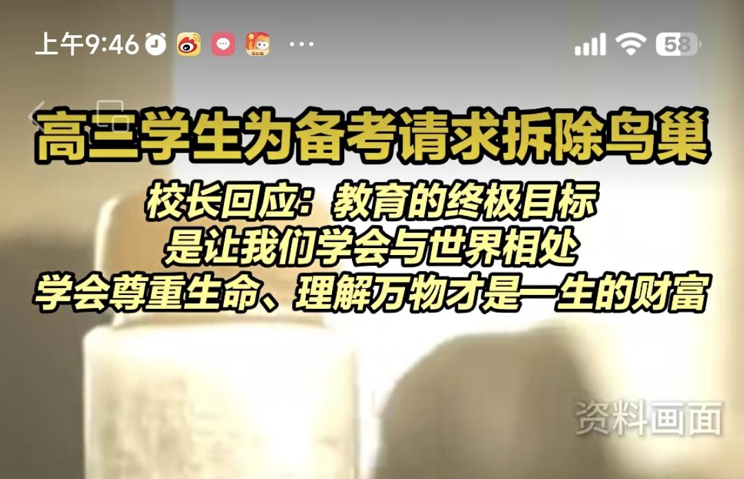 就今天深圳某高中校长回复学生“挪鸟巢”的回信,我上午写了一篇感想,然后有一位网友在我后台留言,这个校长利用这个机会进行生命教育,高瞻远瞩,是最正确的选择,你的眼界怎么跟这个校长比。 看到留言,我不生气,针对每一件事情,每个人观点不一样,有人唱赞歌,也有人会有不同意见,社会的进步也在于此。 校长利用这个机会对学生进行生命教育,让学生顺应自然规律,让噪鹃干扰成为生命的风景,把鸟鸣视为黄昏音乐会,学会与万物对话等等,都是现在流行的教育内容,我并没有否认。 我只是表达这么一个意思,如果我是这所学校的校长,我一定先共情这个学生其实也是一群学生,尽可能解决学生面临的噪音困难,然后再谈生命教育的事情。在高考的关键冲刺阶段,窗外这种鸟穿透力极强不停的叫声,你说没有影响,那是骗鬼。所以如果我看到学生写给我的信,我一定第一时间召集学校主要部领导开会,一起想办法降低鸟儿带的噪音影响,给正在高考冲刺的孩子一个相对安静的环境。我可能首先会想到给教室安双层隔音玻璃,消弥一部分鸟儿的叫声,这确实也是有效的隔音措施,或者想一想,还有没有什么其他学校可以做的措施,因为我这个人始终相信,只要你想办法,最后终究有办法。 当然,很多人说,如果学生连这点干扰都受不了,将来还能成就什么事。其实我对这种观点是不赞成的,站在制高点,没有切身体会,说这些话都非常容易,但如果你的孩子真的在这样环境当中,说这些话可能就没那么轻松了。 我也很欣赏这位校长给学生的回复,说得很有道理。但对孩子们来说,冲刺高考真是人生中最重要的一段时间,想尽一切办法给他们创造相对安静的学习环境,这一点都不过分,这是我们应当做的,不用上纲上线到“这点干扰都受不了,将来还能干什么大事的程度。”尊重自然和以人为本真的一点都不矛盾。