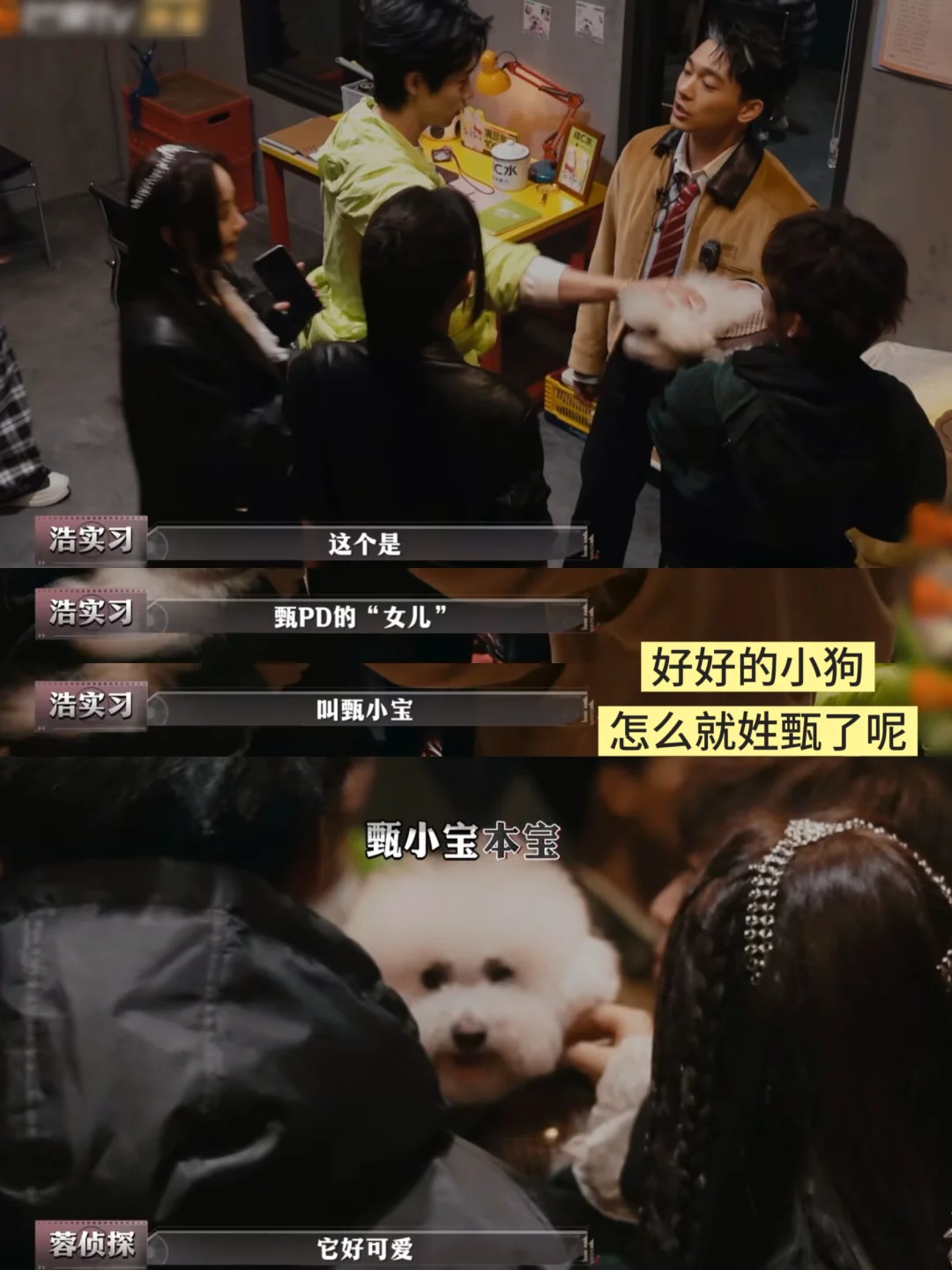 当小狗狗出现,全员秒变夹子音哈哈哈哈 小狗见到大家尾巴都摇成螺旋桨了 话说甄也是太搞笑 要求每天《准时送给甄rua1小时,培养父女感情》虽然人坏但对狗狗还挺好[笑哭R]
