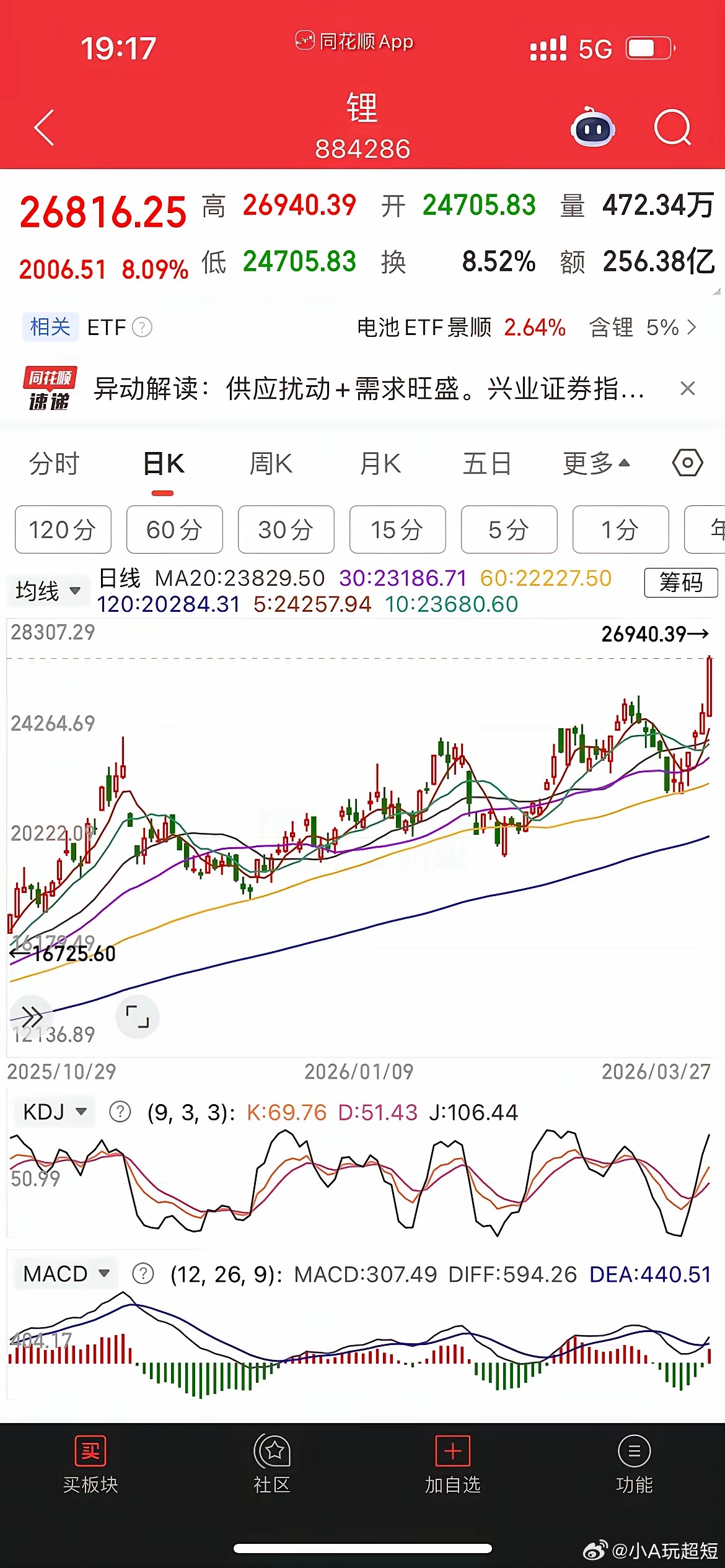 锂矿大涨,电池站上所有均线,即将变盘?1、锂。今天大涨8%,突破了11.19号以来的横盘区间,向上行情已经打开,接下来看看会不会回踩下箱体上边界给机会。不给机会没办法上车,目前周线、日线都是多头。5天均线不破,继续看涨。2、电池。和锂矿一样横盘了很长时间,今天中阳线,站上了所有均线,电池5、10、20、30、60、120均线高度粘合,均线粘合必变盘,而且这次变盘级别非常大,粘合均线非常多。个人倾向于像锂矿一样向上变盘。在没有大涨之前,可以部分仓位埋伏。股市分析
