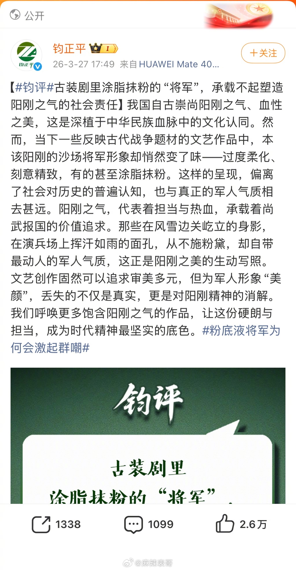 张凌赫的粉底液将军出圈了,钧正平发文说粉底液将军「承载不起塑造阳刚之美的社会责任」。